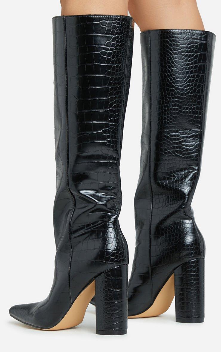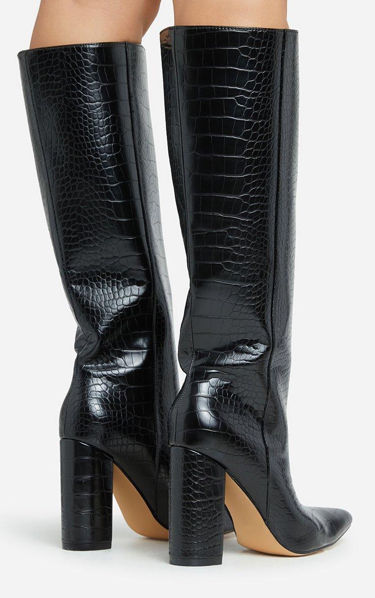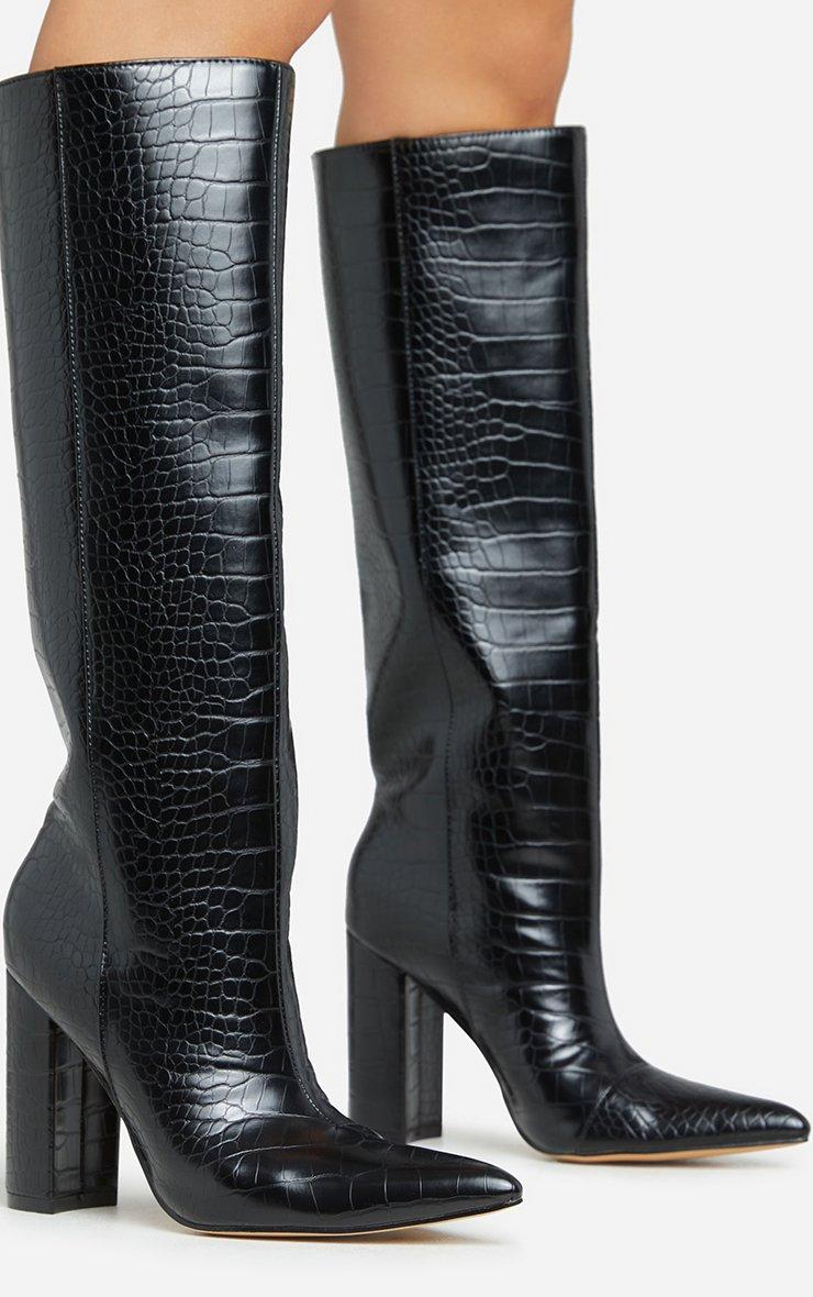Louise Pointed Toe Block Heel Knee High Long Boot In Black Croc Print Faux Leather