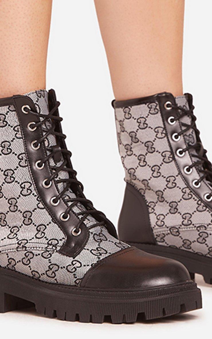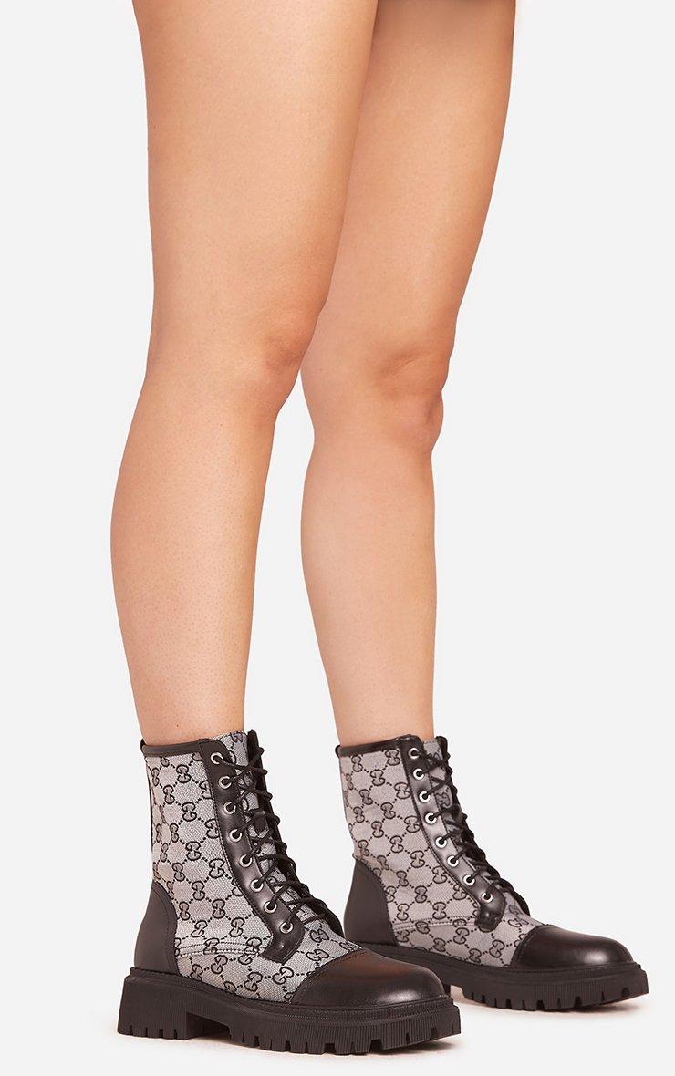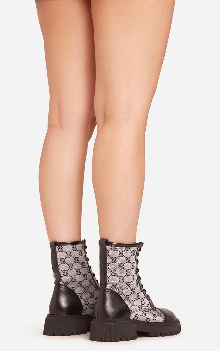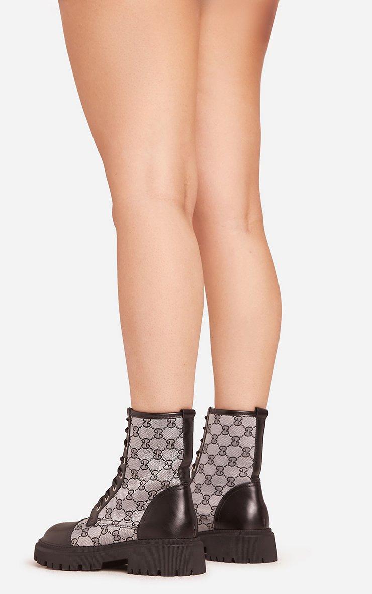Rocha Lace Up Printed Detail Chunky Sole Ankle Biker Boot In Black Faux Leather