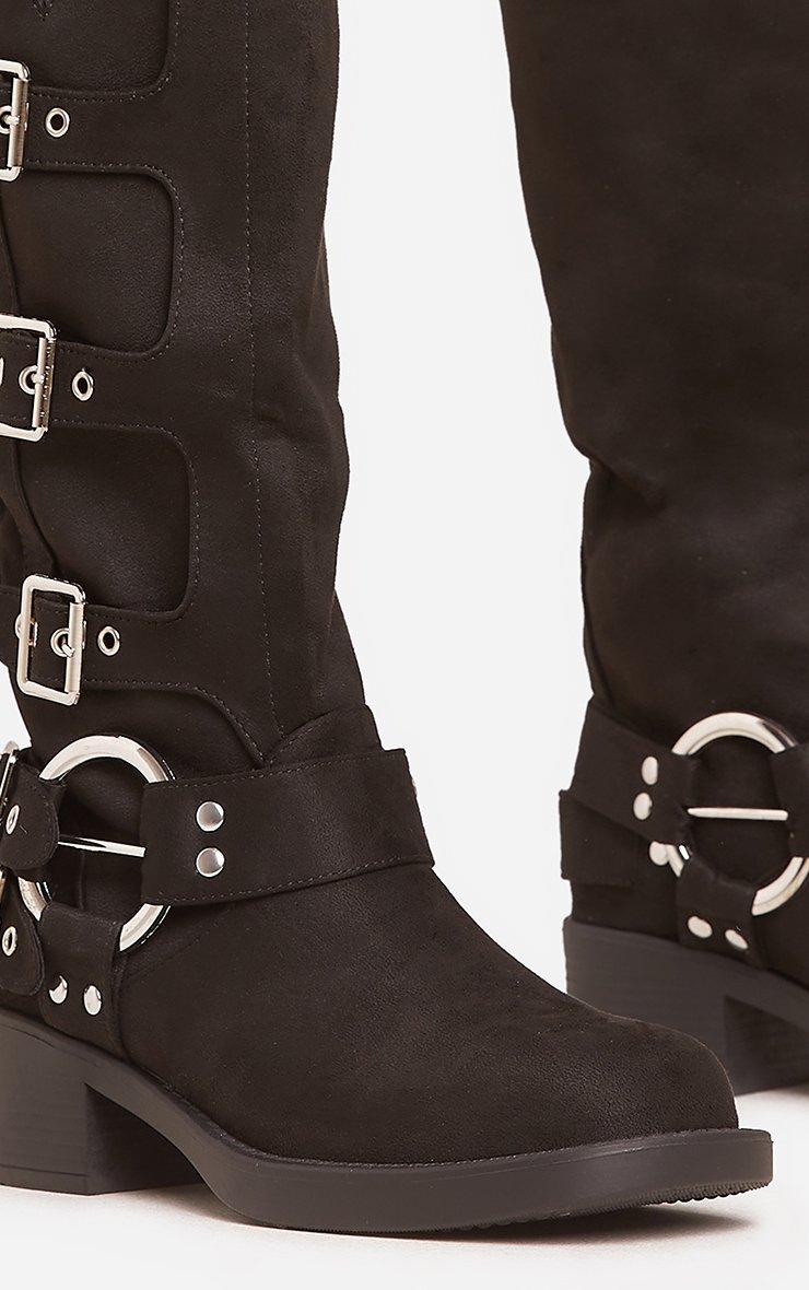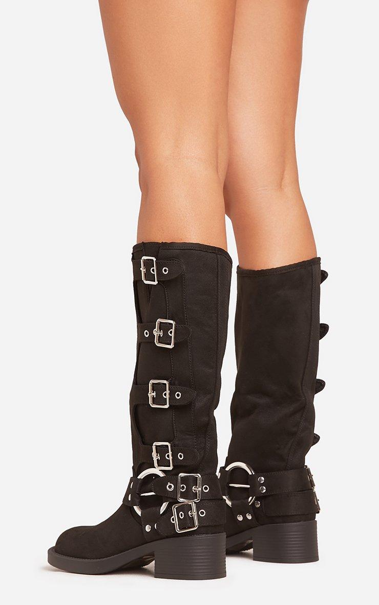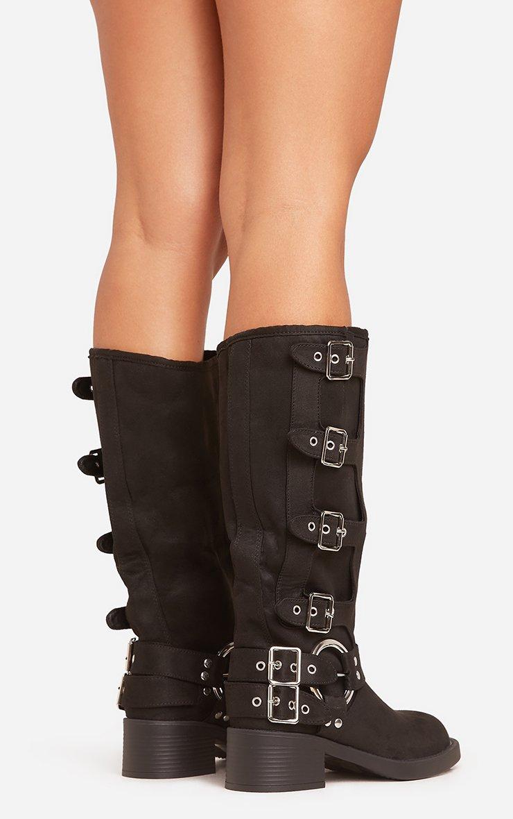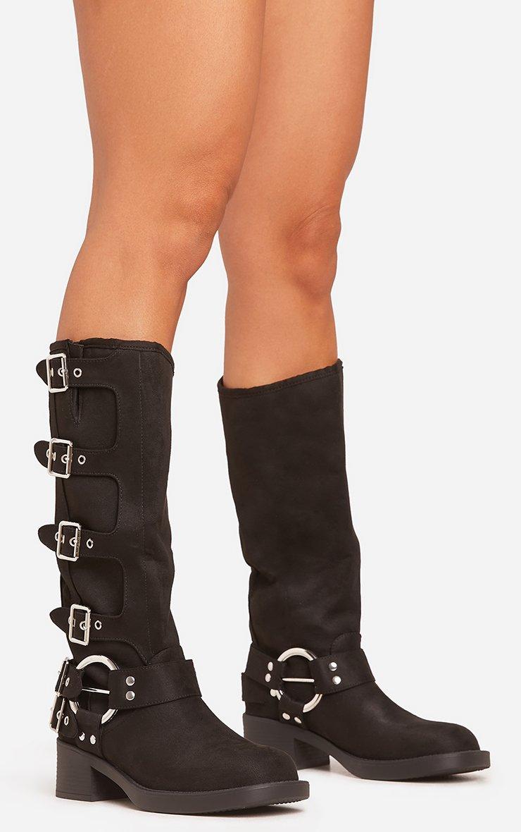Buckle-Down Side Buckle Detail Midi Calf Biker Boot In Black Faux Suede