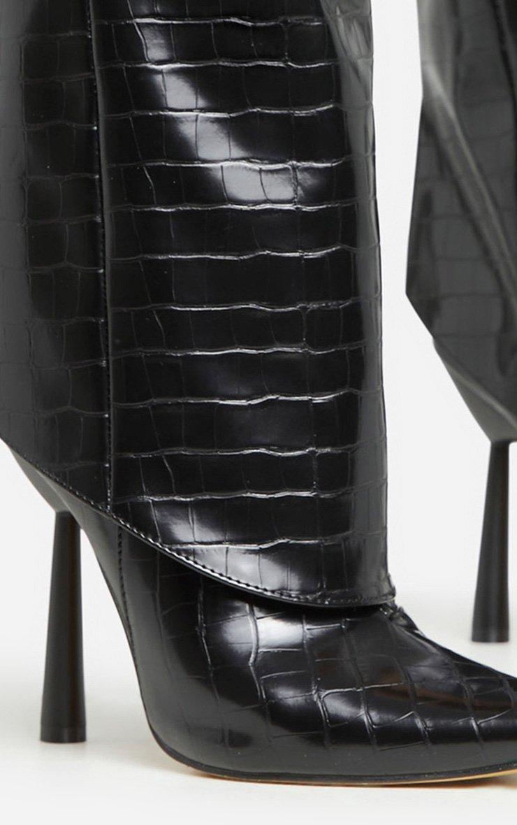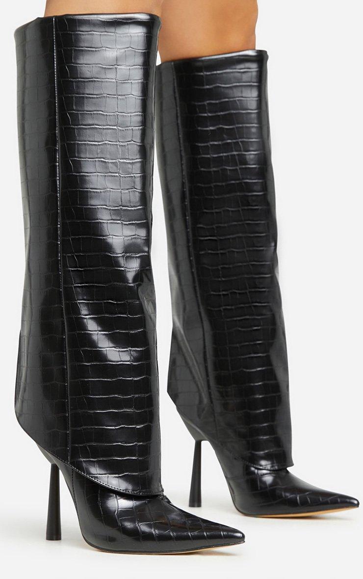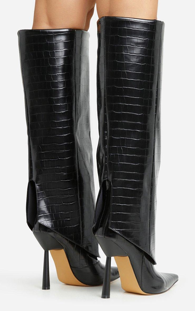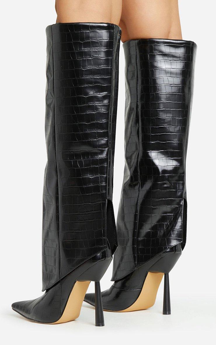 New season EGO has officially dropped and we are obsessed. Featuring a black croc print faux leather material, with layered detailing, a pointed toe, thin round heel and a knee high length.