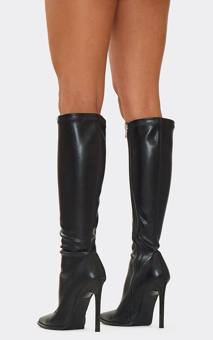 Step into sleek, doll! These black faux leather knee-high boots feature pointed toes and stiletto heels for a fierce, polished finish that demands attention.