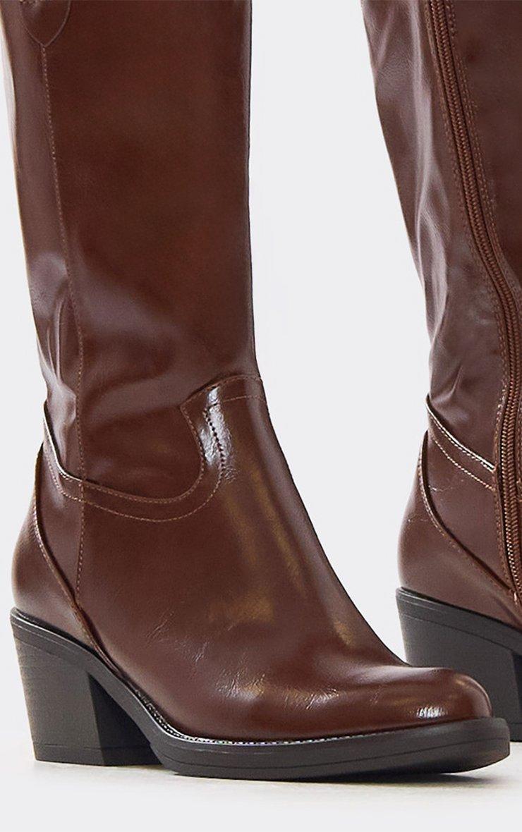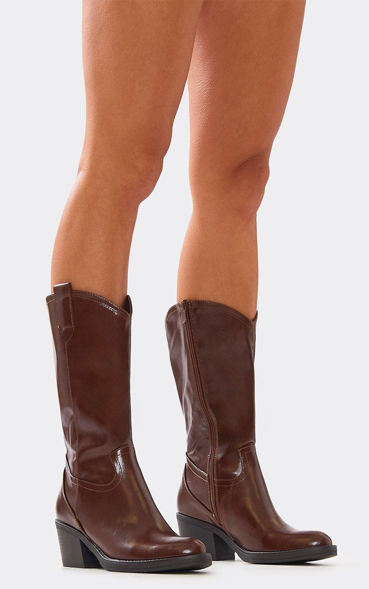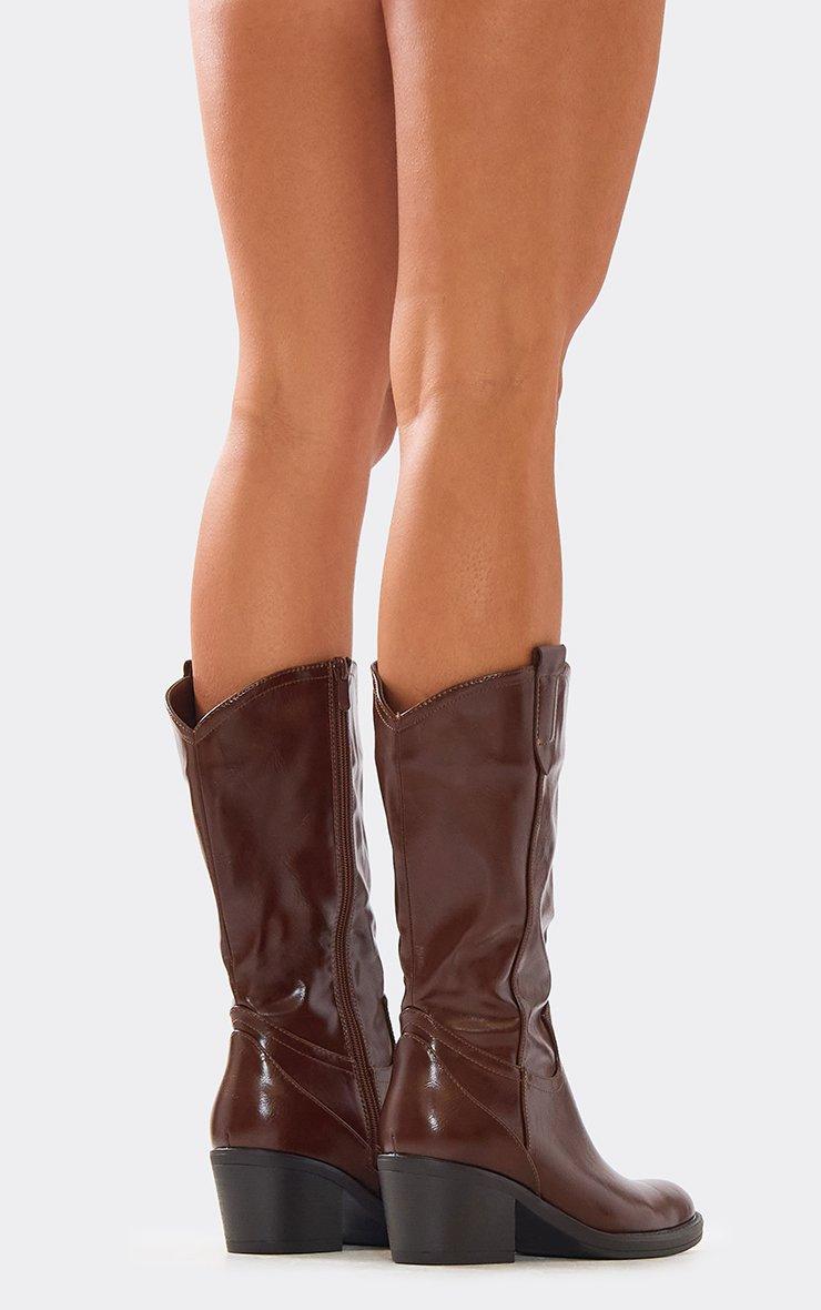 Western vibes, doll. Featuring a brown patent material with heel and mid calf detailing, these cowboy boots are giving bold, chic energy for statement footwear.