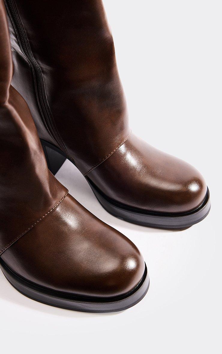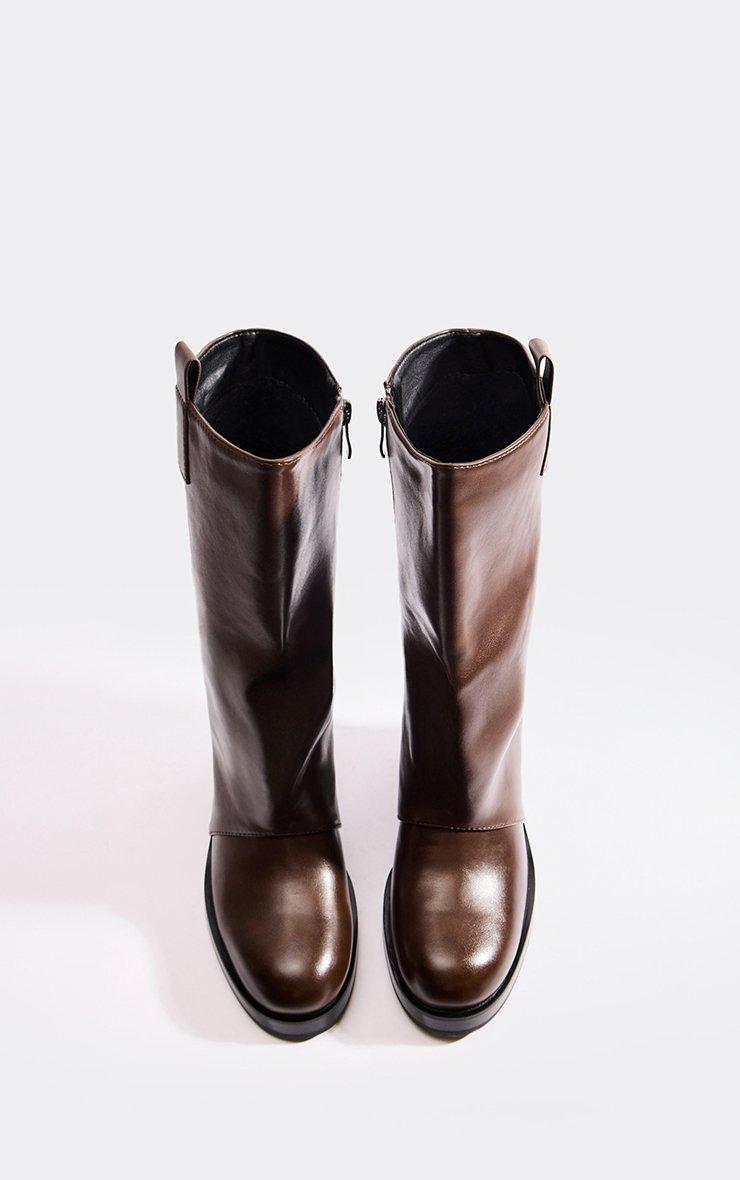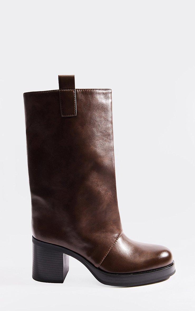 Serve bold-chic vibes, doll! Made in brown faux leather, these mid-calf boots feature a platform block heel, giving your outfit a stylish, statement-ready finish.