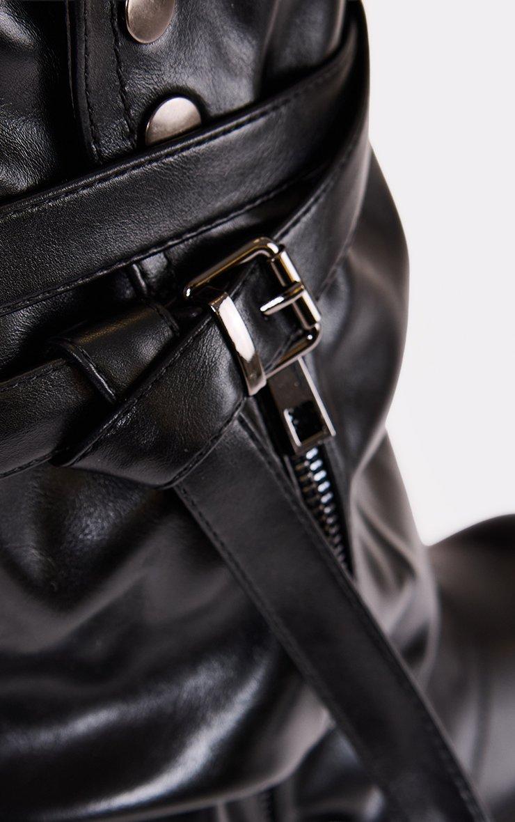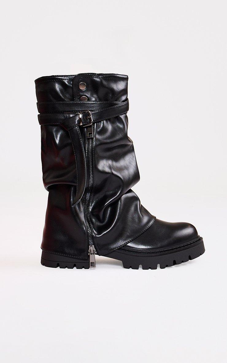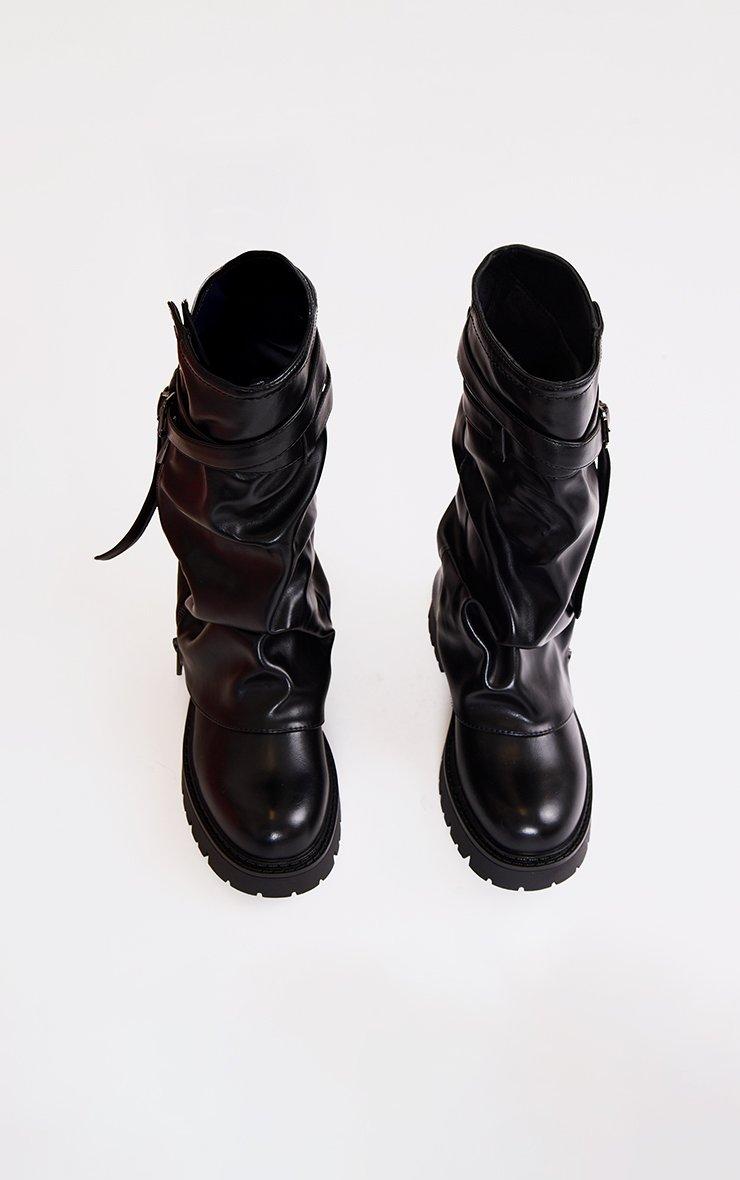 Add major attitude to your look with these black faux leather biker boots, featuring a side zip, buckle layered detailing, and chunky soles for that bold, street-ready edge.