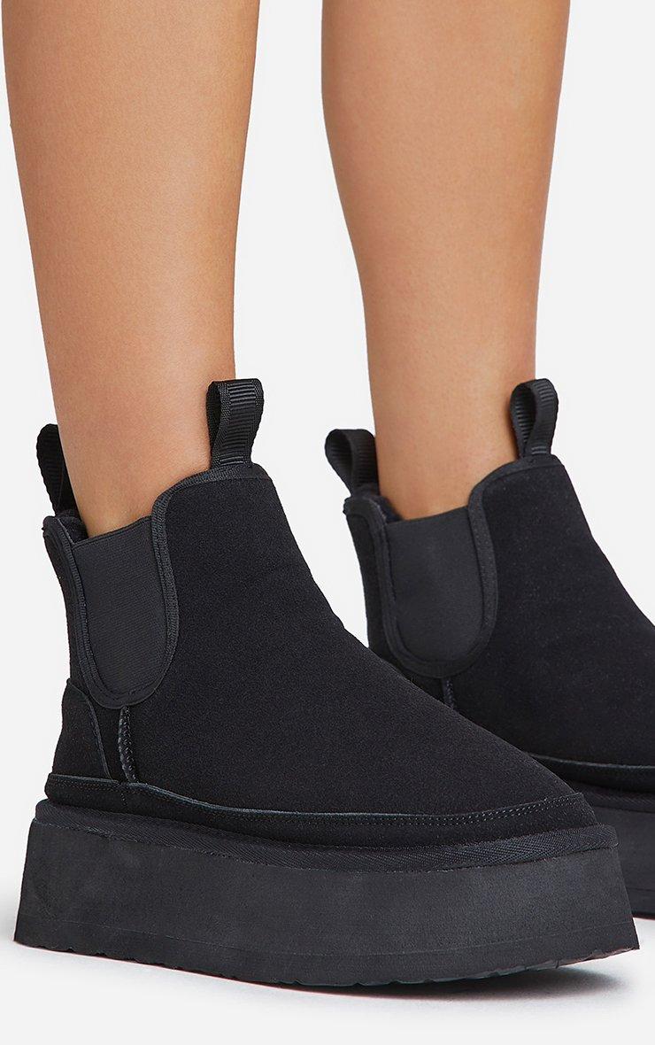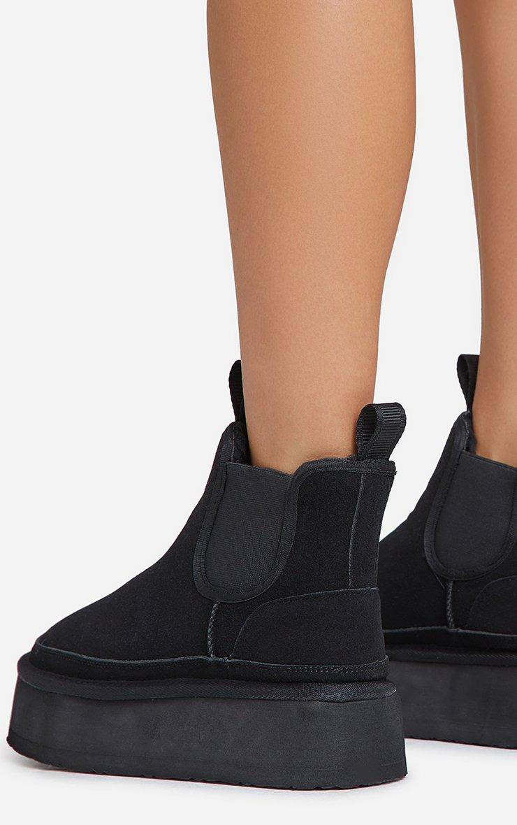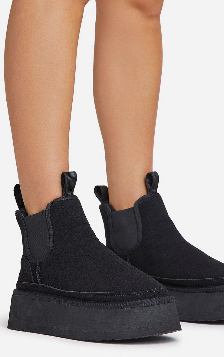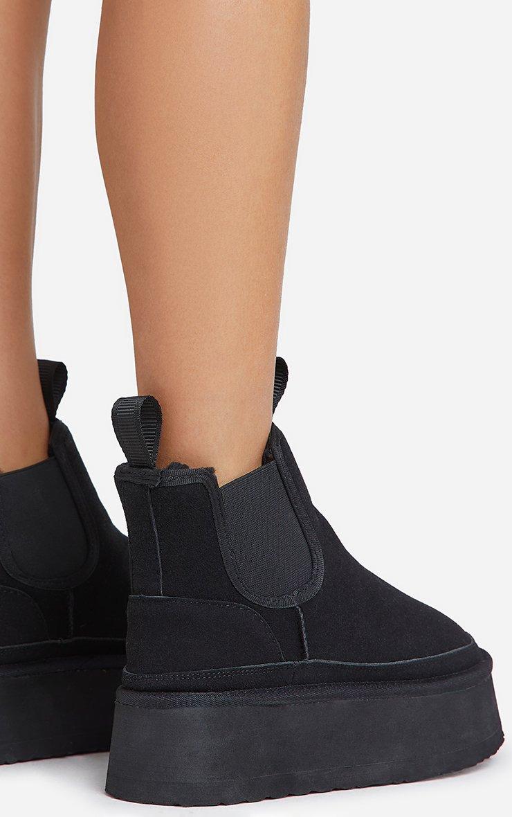 Spiced-Chai Elasticated Detail Platform Sole Faux Fur Lining Ankle Boot In Black Faux Suede