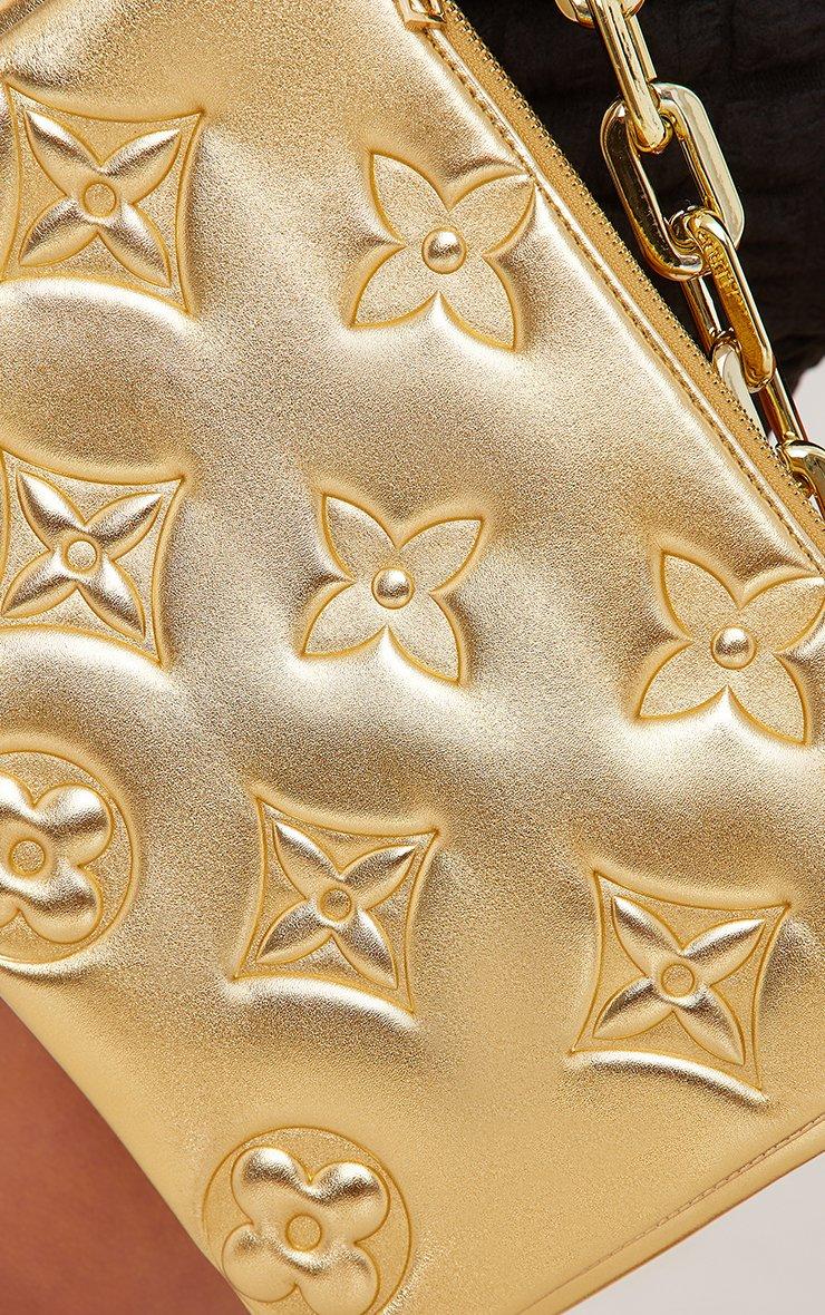 Take your look to a whole new level with this statement bag doll. Featuring a gold faux leather material, with embossed detailing and an oversized clutch bag design.