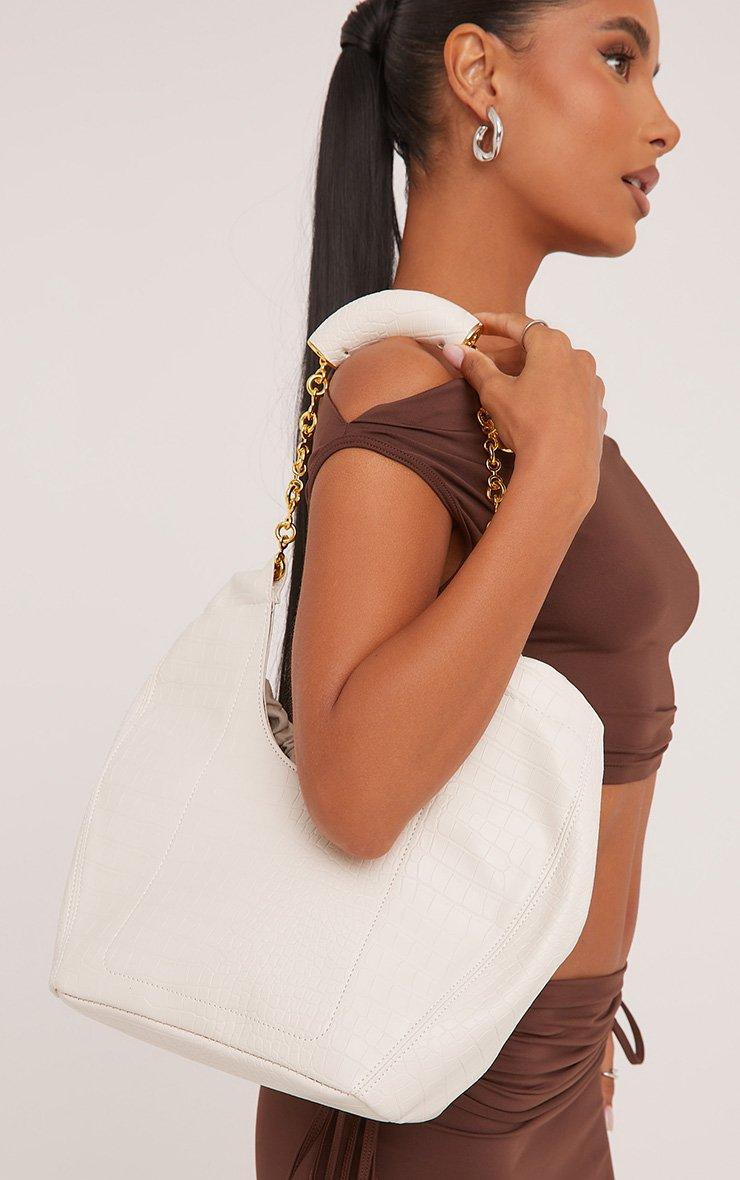 Hayden Ruched Detail Chain Strap Shoulder Bag In Cream Croc Print Faux Leather