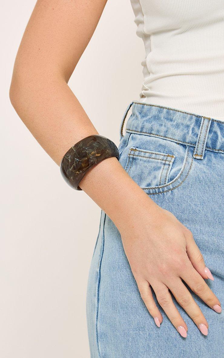 This oversized chunky bangle bracelet in rich brown resin exudes sophistication and boldness. Its statement design adds a touch of elegance, making it the perfect accessory to elevate your outfit with ease.