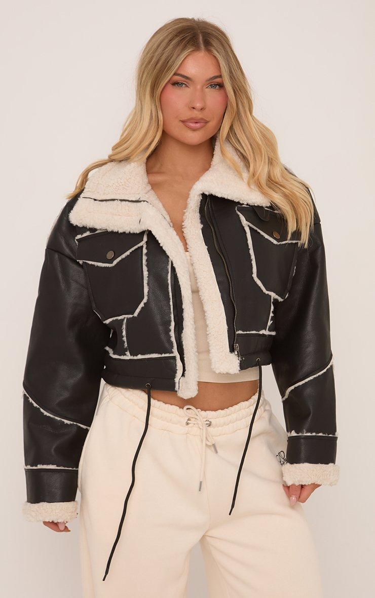 Pocket Detail Faux Shearling Aviator Jacket In Black