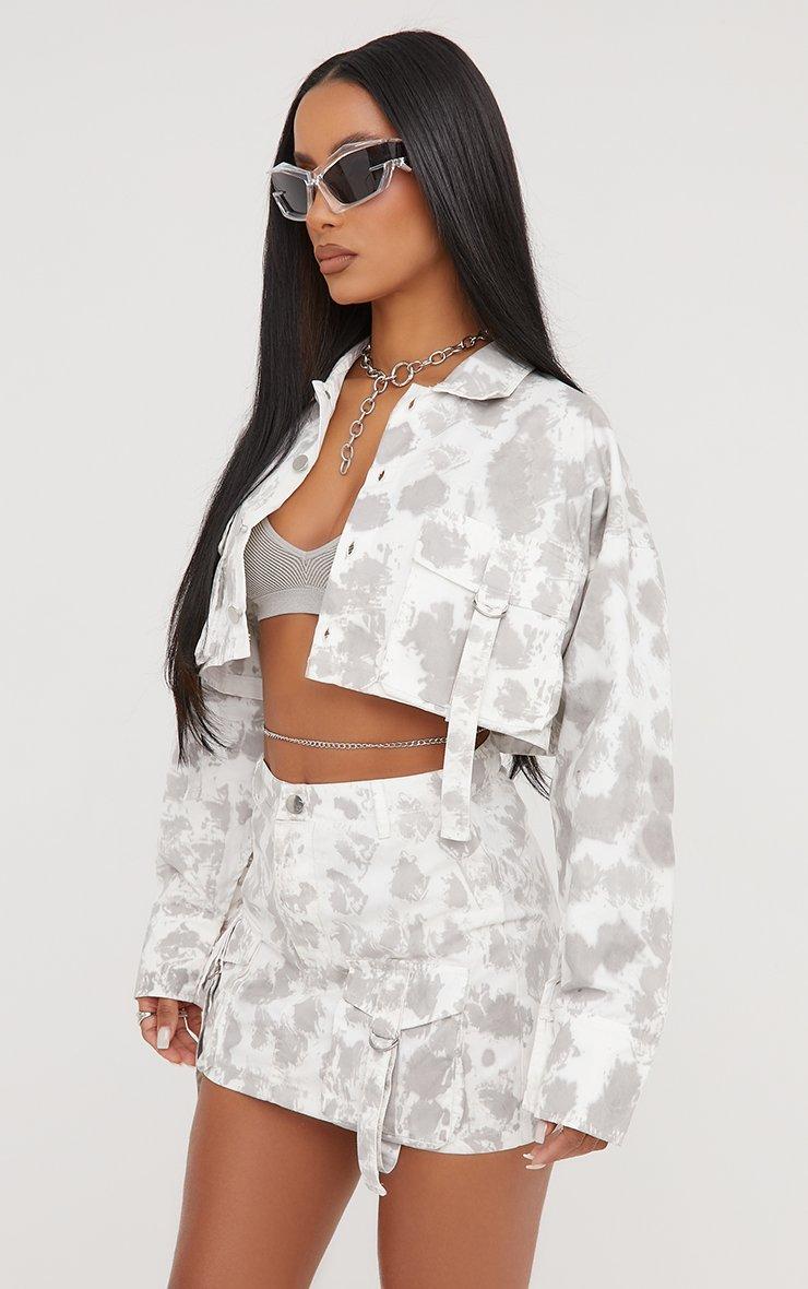 Oversized Belt Detail Cargo Style Cropped Jacket In Cream Acid Wash