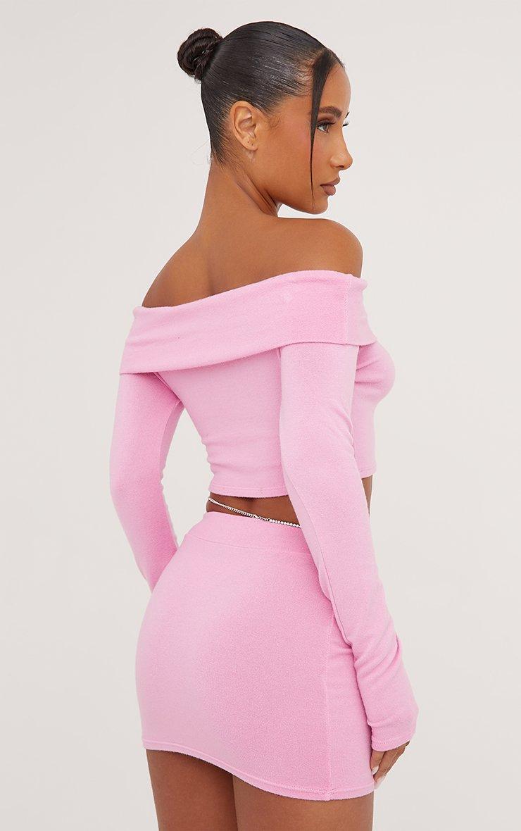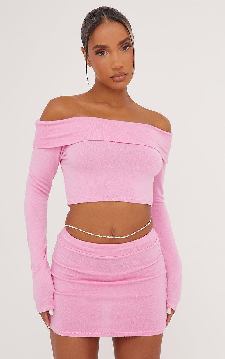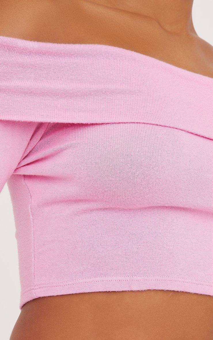 Long Sleeve Bardot Fold Over Crop Top In Pink Knit