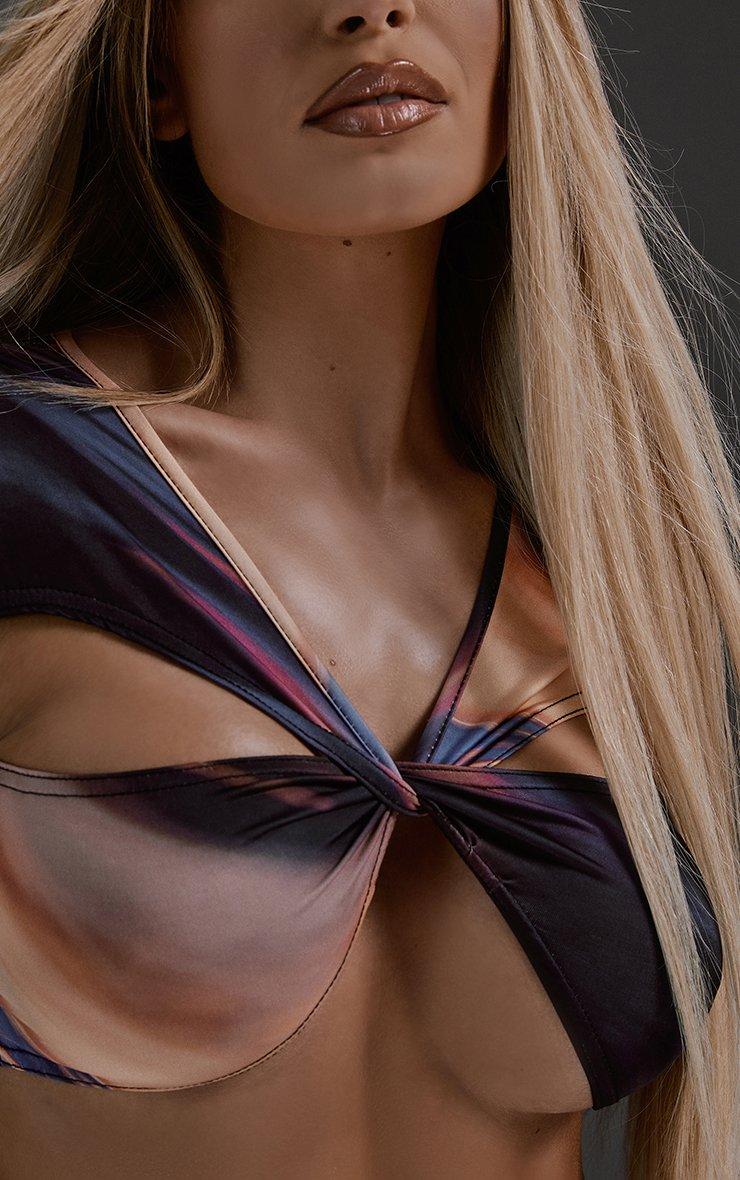 Long Sleeve Twisted Front Detail Crop Top In Multi Print Slinky