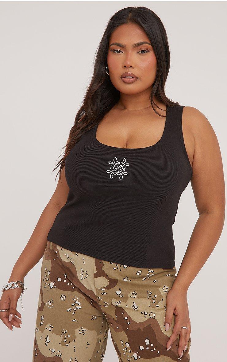 Give your off duty wardrobe a new season update doll. Featuring a black ribbed material, with embroidered graphic swirl detailing, a scoop neckline and a vest top design.