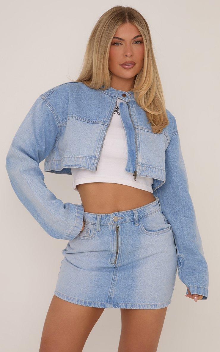 This jacket is a must have for your OOTD. Featuring a blue denim material, a high neck, zip front, a motocross design and a cropped length.