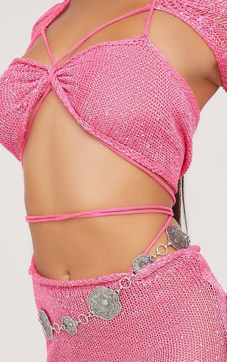 Halterneck Sequin Strappy Detail Bralet With Sleeves And Mini Bodycon Skirt Co-Ord Set In Pink Knit