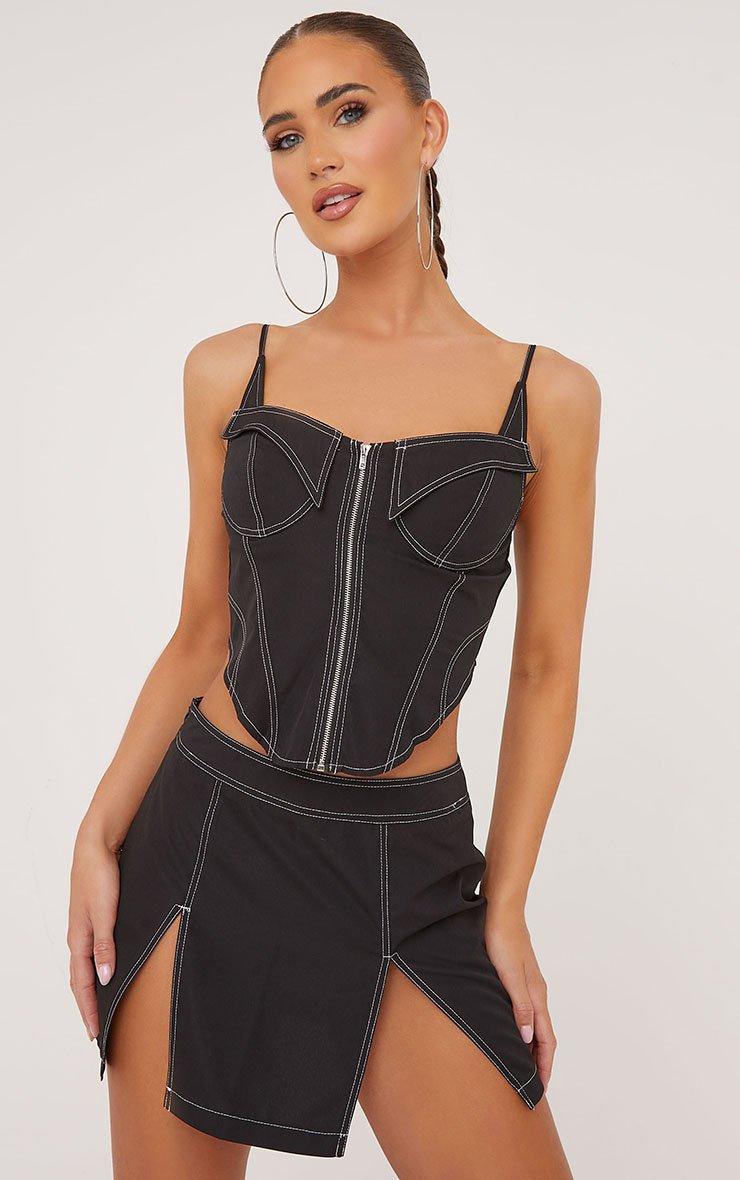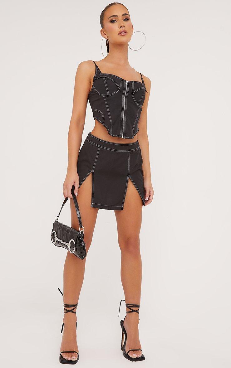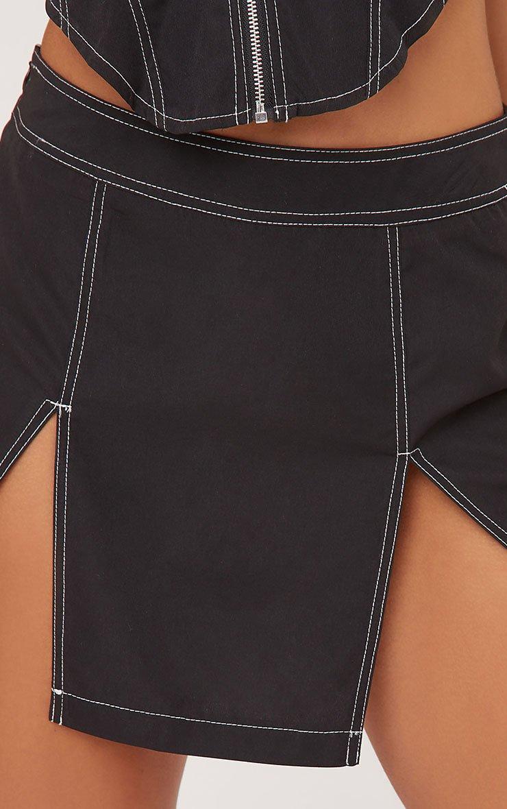 Have all eyes on you with this skirt. Featuring a black material, a contrast stitch design, a high waist, split leg detailing and a mini length.