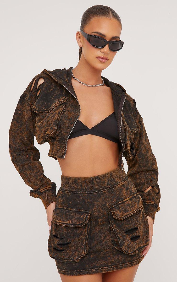 Long Sleeve Pocket Detail Distressed Cropped Cargo Jacket In Brown Acid Wash