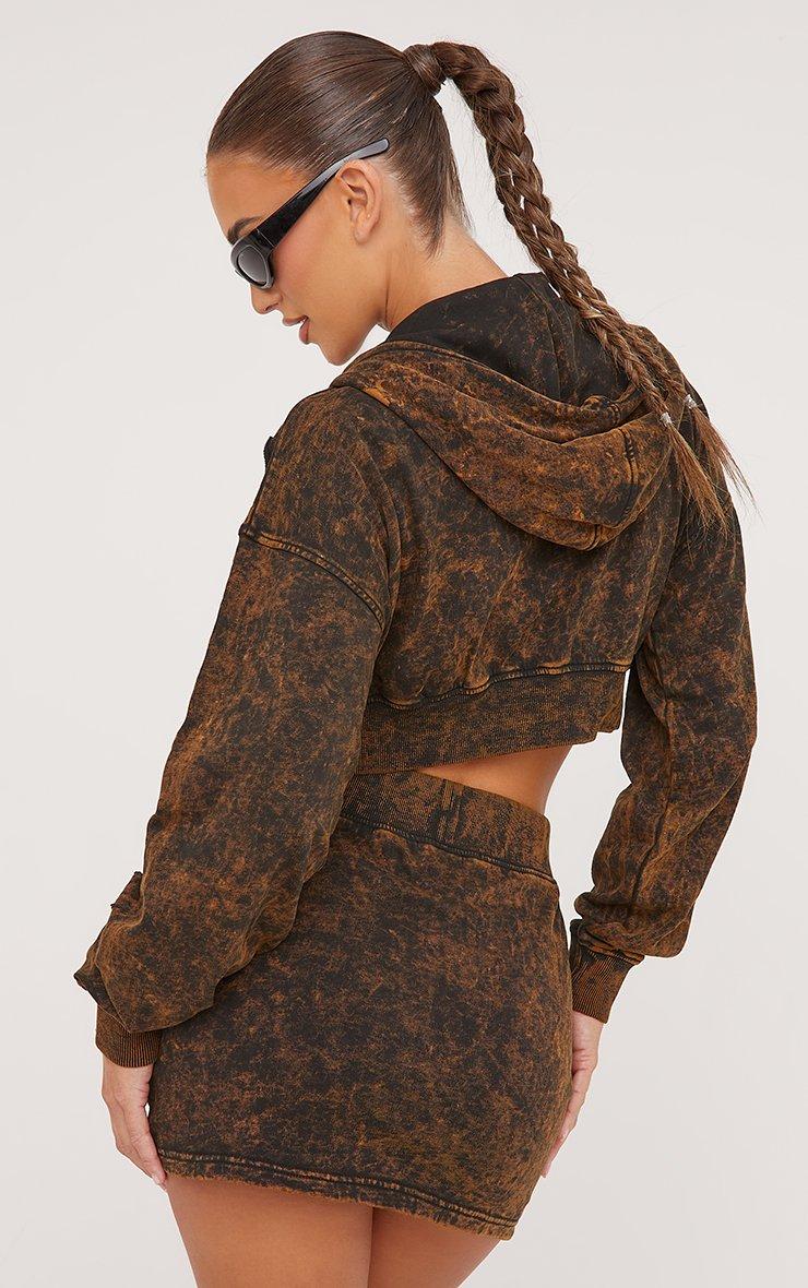 In need of a wardrobe freshen up? We've got you covered doll. Featuring a brown acid wash material, long sleeves, pockets, distressed detailing and a cropped length.