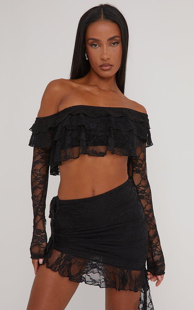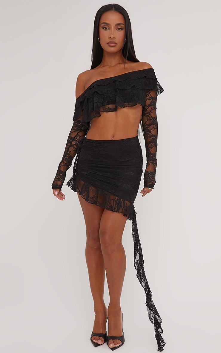 Our best seller just dropped in a new colour and we're obsessed. Featuring a black lace material, an asymmetric waist, frill detailing and a mini length.