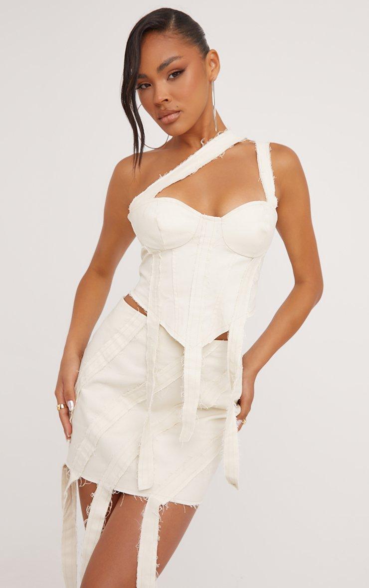 High Waist Raw Edge Strap Detail Mini Skirt In Stone Canvas