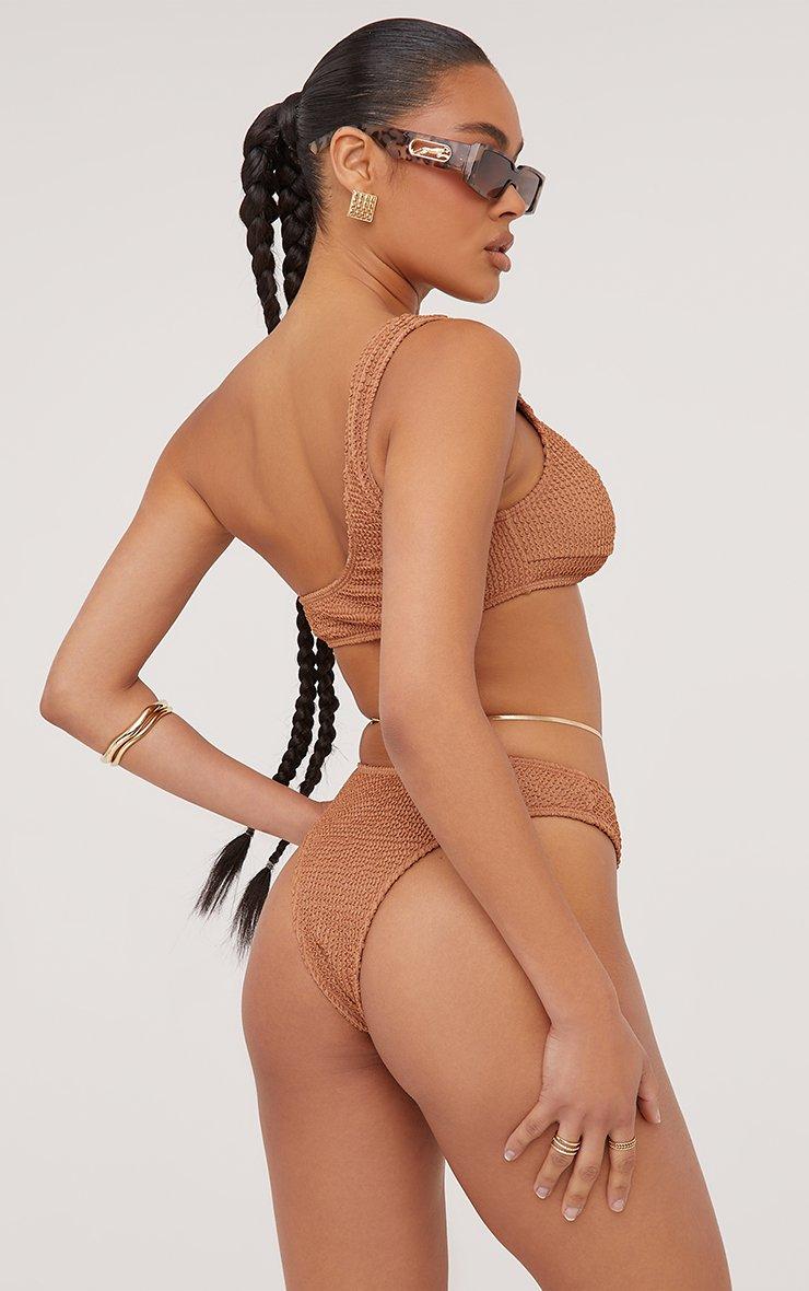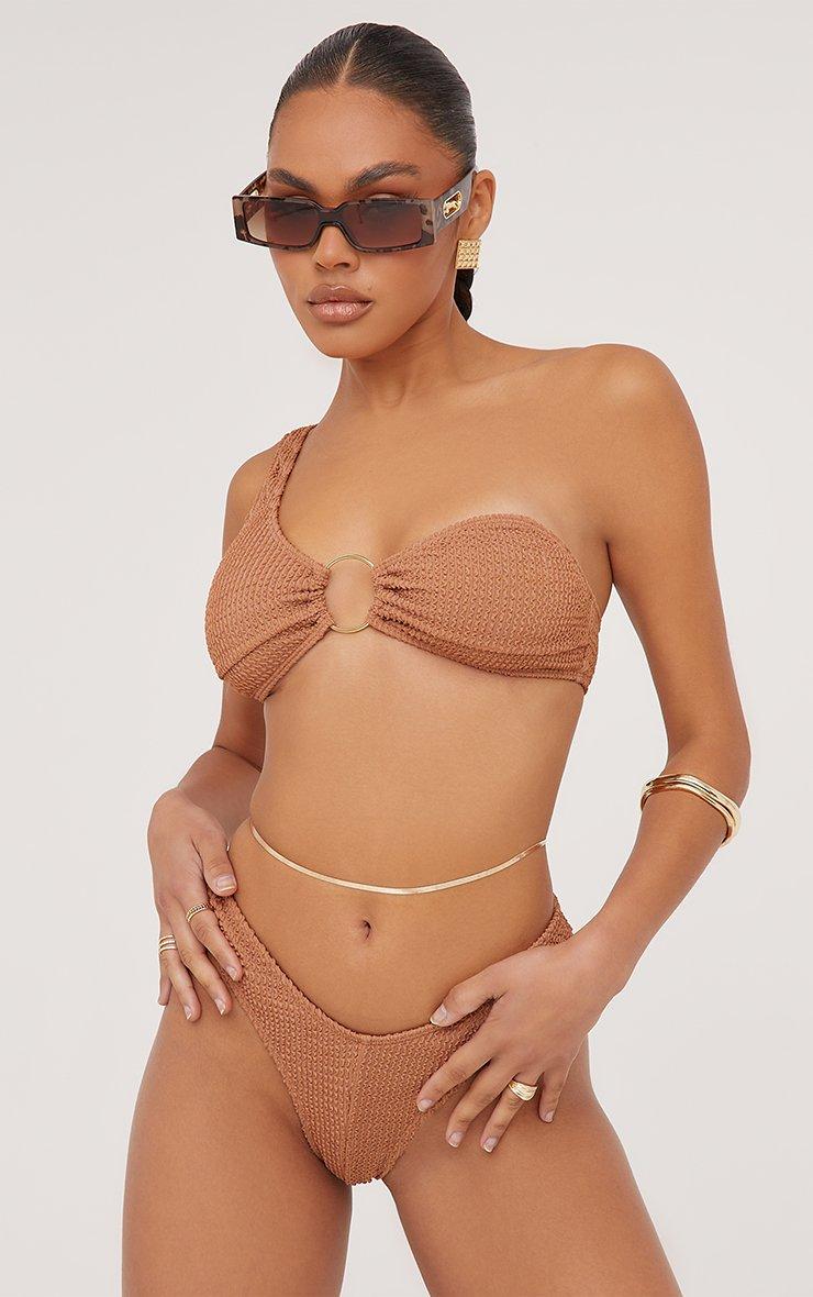 One Shoulder Ring Detail Textured Bikini Set In Brown