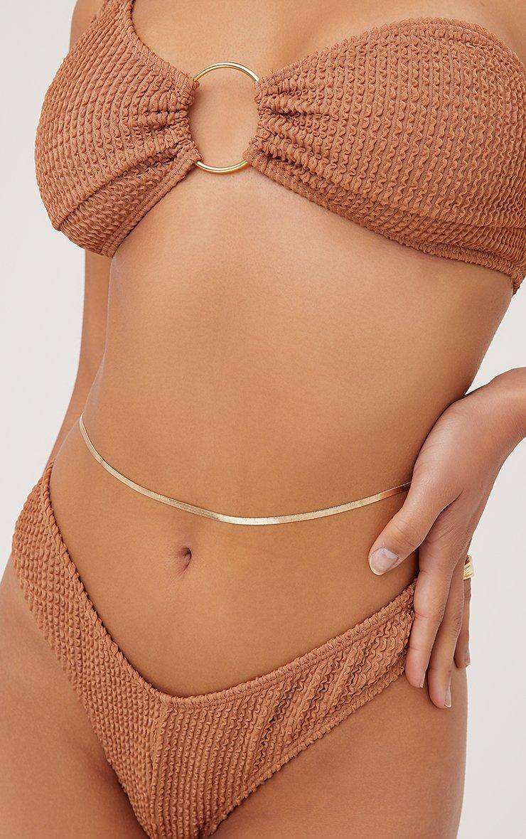 Work these neutrals into your vacay wardrobe with this bikini set doll. Featuring a tan textured material, a one shoulder ring detail bikini top and matching bottoms.