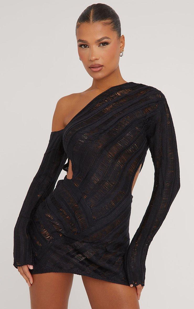 Hit refresh on your A/W wardrobe with this dress. Featuring a black knit material, ladder detailing, a bardot neckline, cut out sides and a mini length.