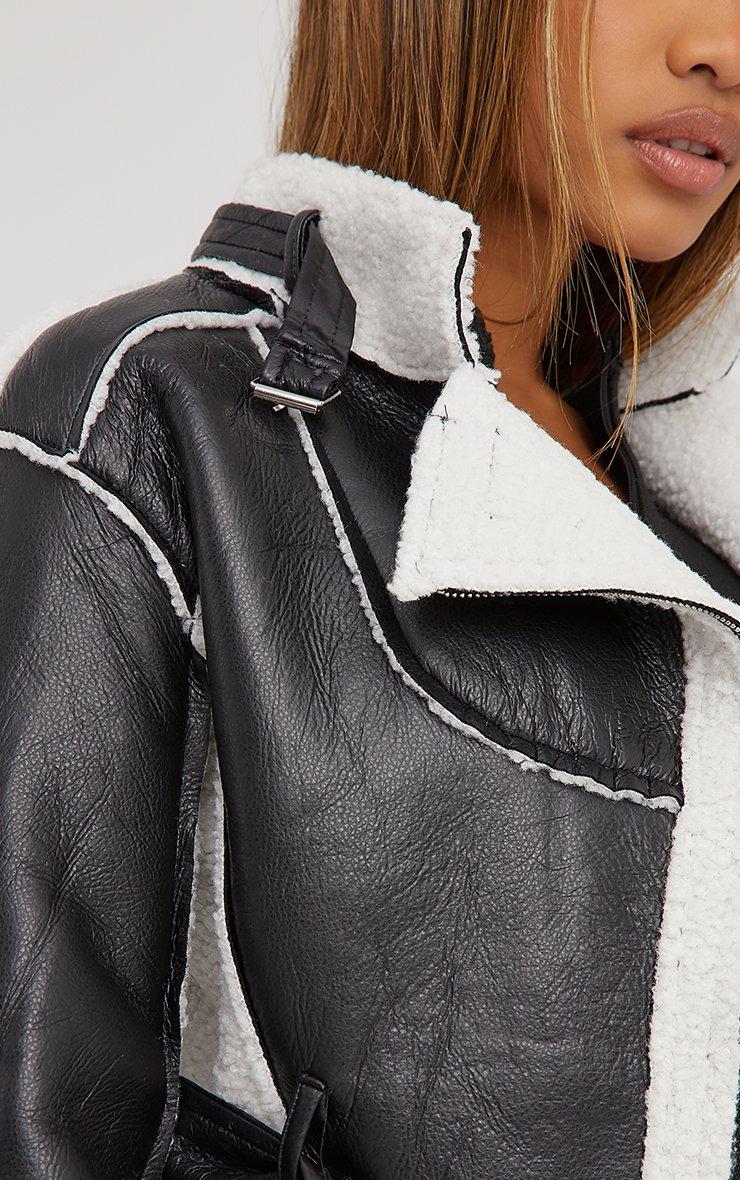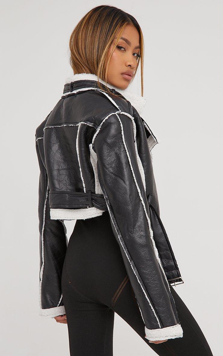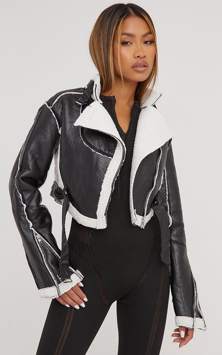 Faux Shearling Piping Detail Dipped Hem Cropped Aviator Jacket In Black Faux Leather
