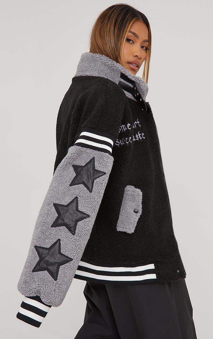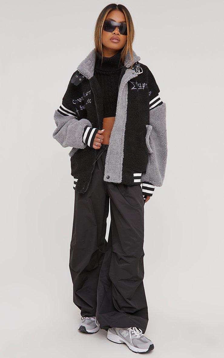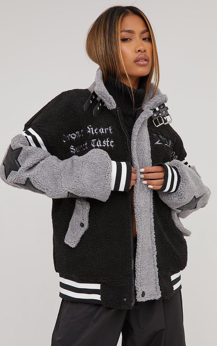Complete your new season look with this essential jacket doll. Featuring a grey and black borg material, with buckle detailing, an oversized fit and a bomber jacket design.