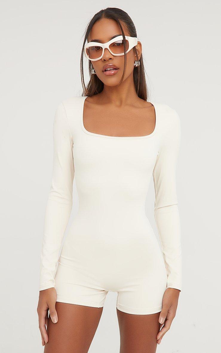 Long Sleeve Scoop Neck Super Stretch Playsuit In Cream