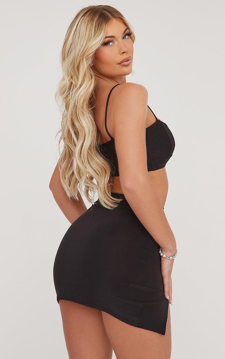 Your weekend attire just got an update with this top doll. Featuring a black slinky material, thin straps, cupped detailing and a cropped length. Team this with the matching skirt for a look that's sure to make you stand out.