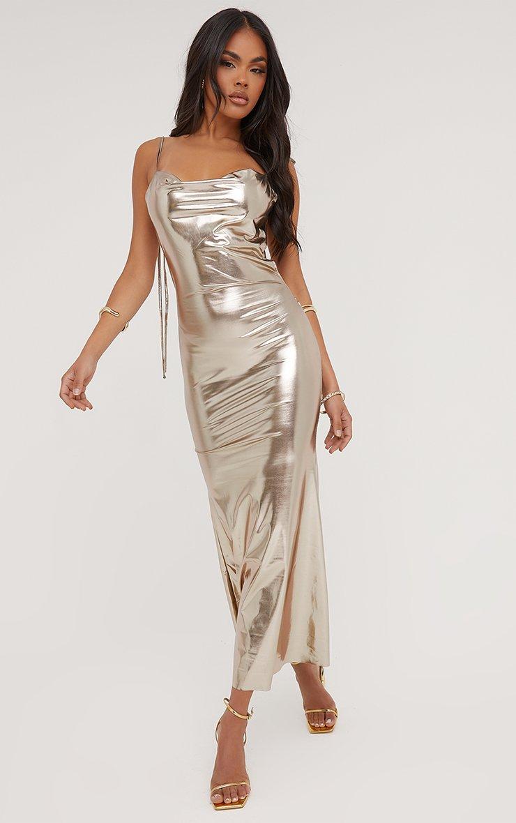 Cowl Neck Strappy Detail Open Back Maxi Dress In Champagne Metallic