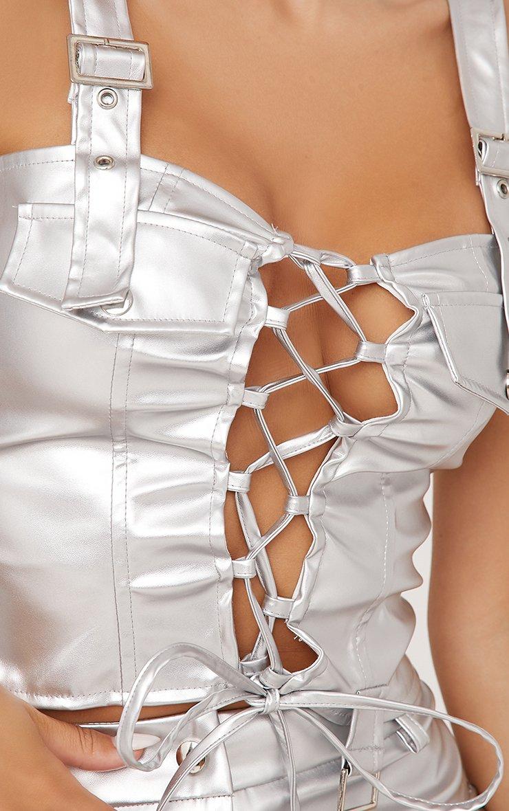 Hit refresh on your raving attire with this top doll. Featuring a silver metallic material, a square neck, lace up detailing, buckle straps and a corset design.