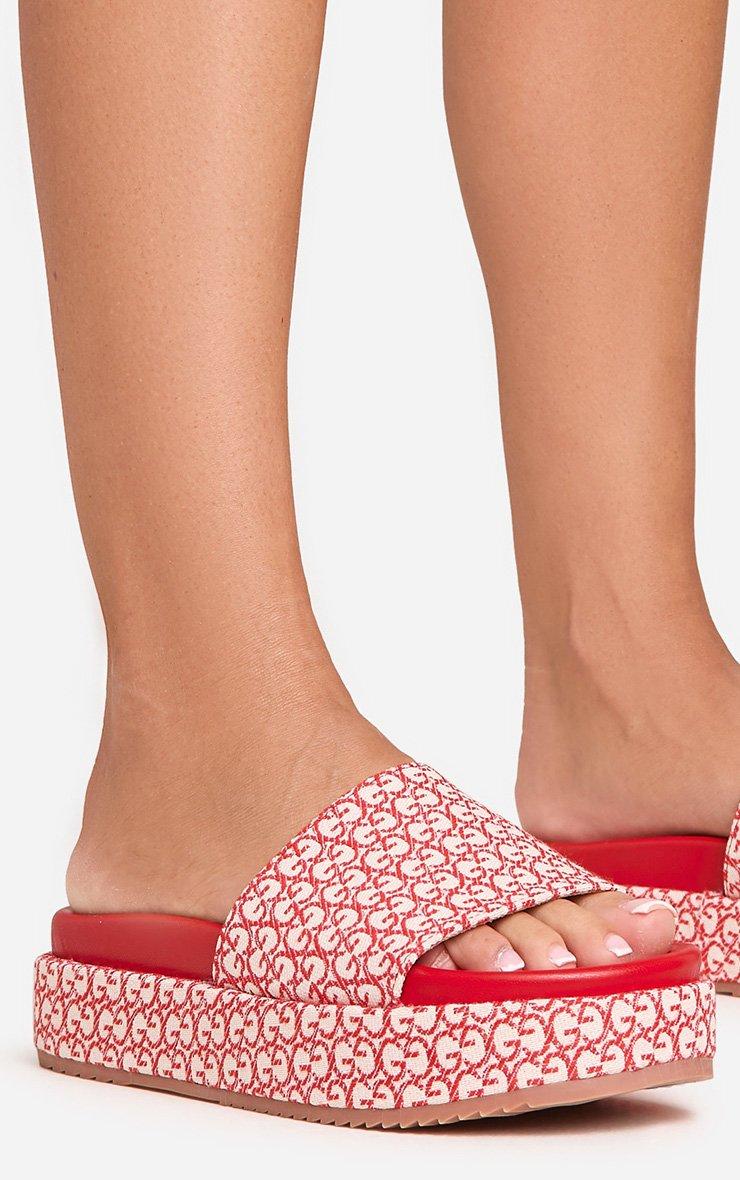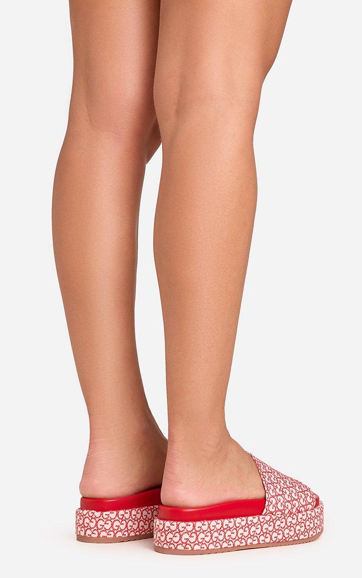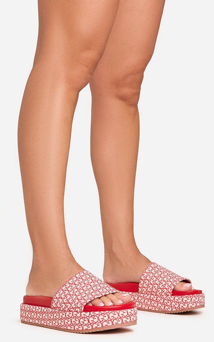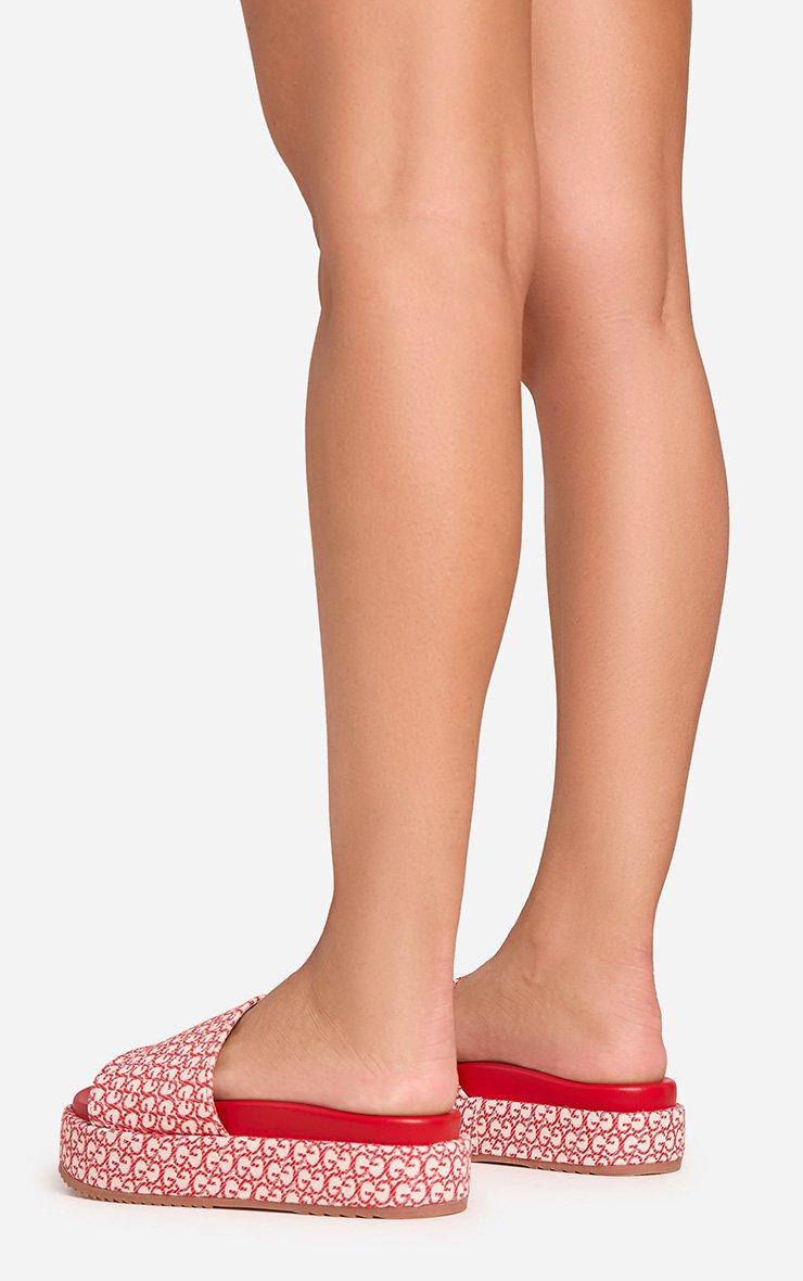 Frenzy Printed Detail Peep Toe Flatform Slider In Red Fabric