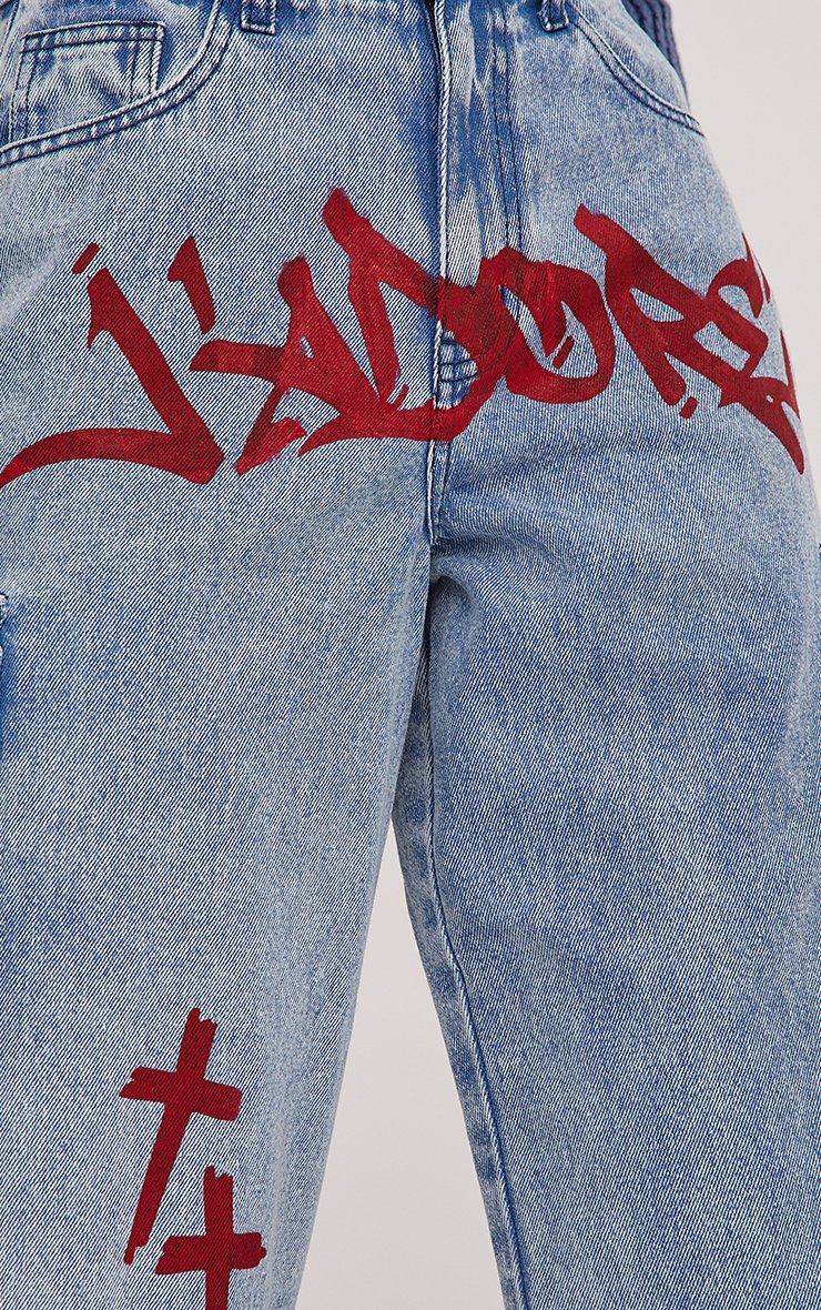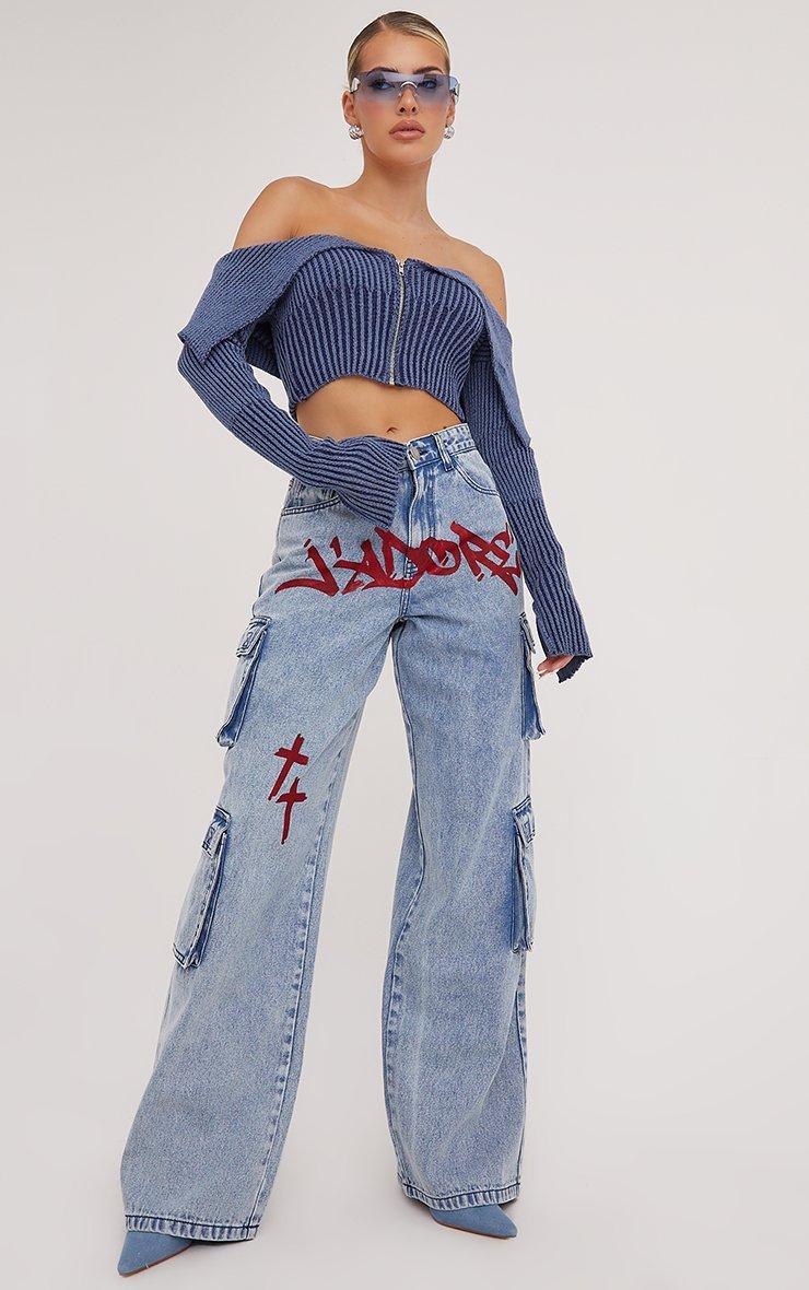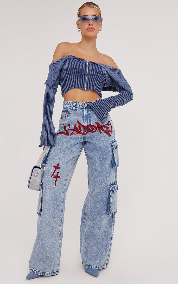 Grunge up your off duty look with these jeans. Featuring a blue denim material, a mid rise, a J'Adore crucifx print and a wide leg style.