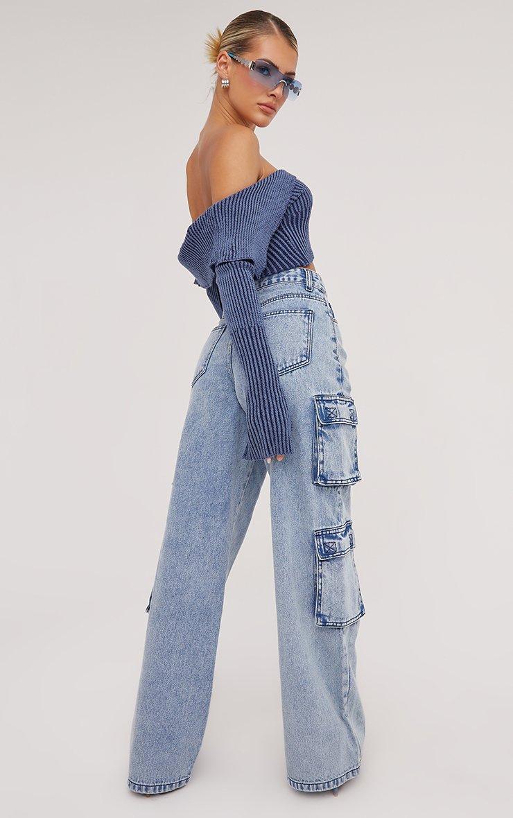 Mid Rise 'J'Adore' Crucifix Print Wide Leg Cargo Jeans In Blue Denim