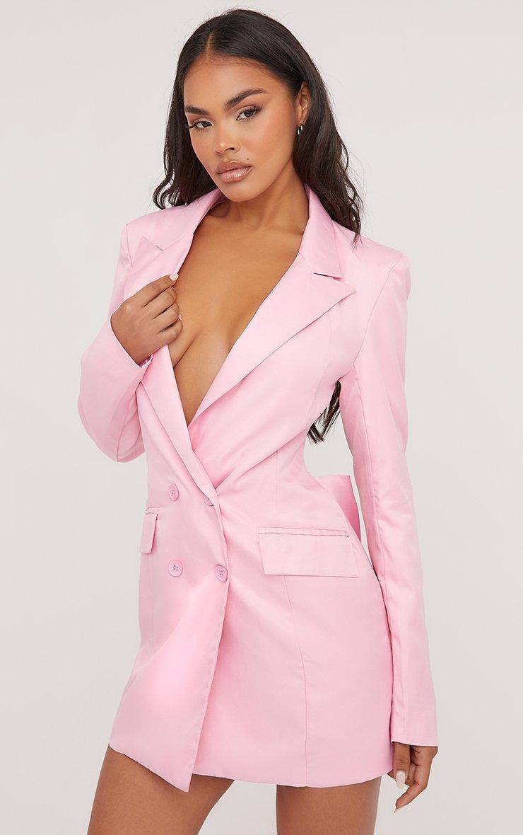 This blazer dress is perfect for your date night girl. Featuring a pink material, pointed shoulders, an open back detail and a mini length.