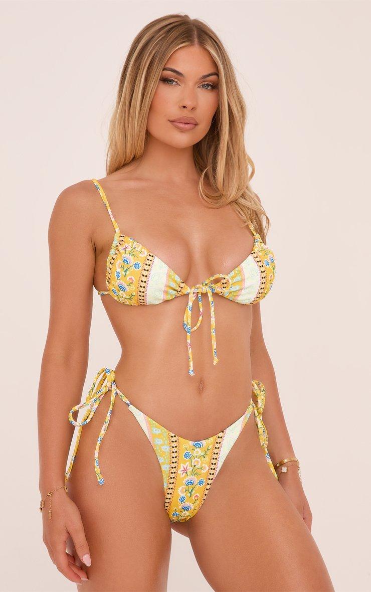 Add a pop of colour to your sun drenched days with this bikini. Featuring a multi yellow material, a paisley print and a tie front.