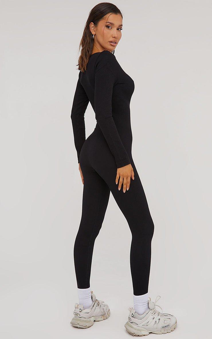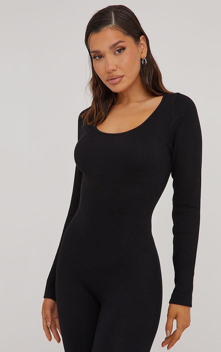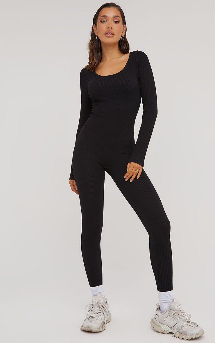 His refresh on your off duty attire with this jumpsuit. Featuring a black seamless material, a scoop neck, long sleeves and a cinch waist.