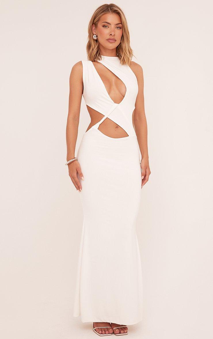 High Neck Twist Cut Out Detail Maxi Dress In White Slinky