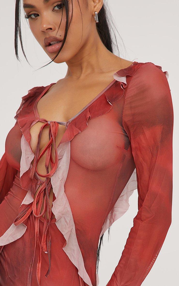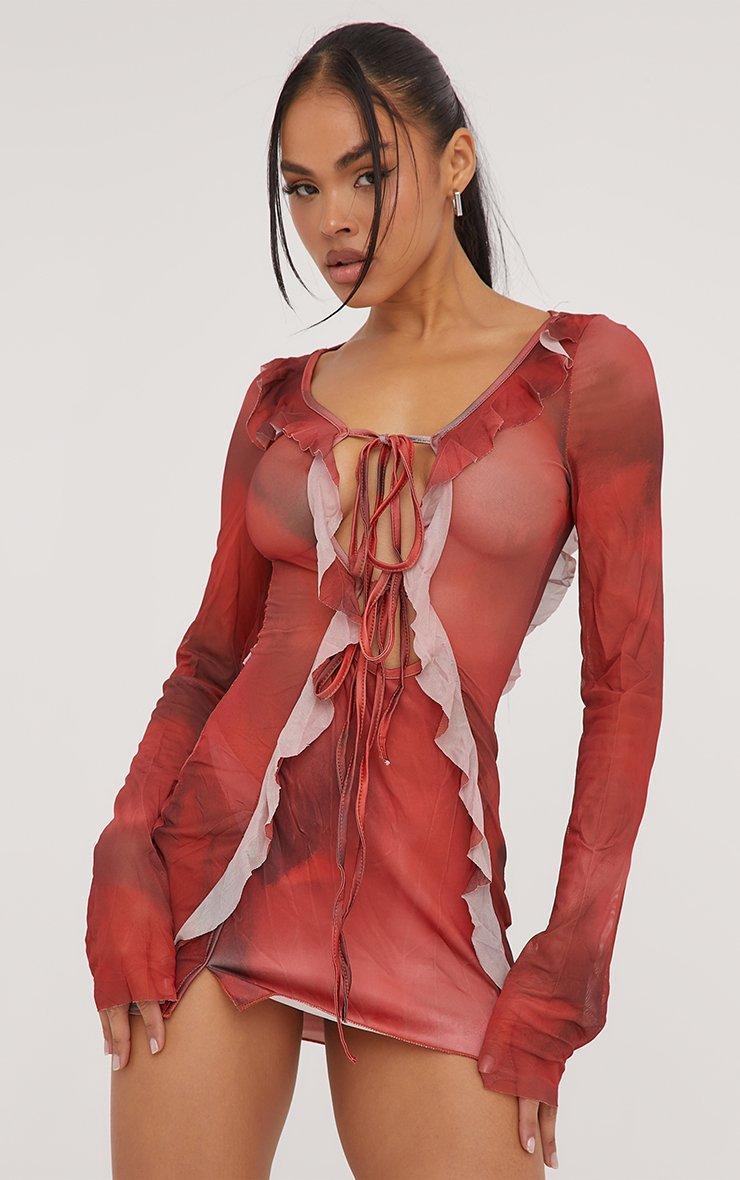 We love this dress for your upcoming date night. Featuring a red printed mesh material, long sleeves, a tie front, frill detailing and a mini length.