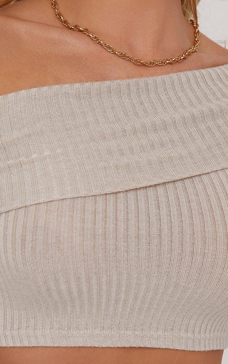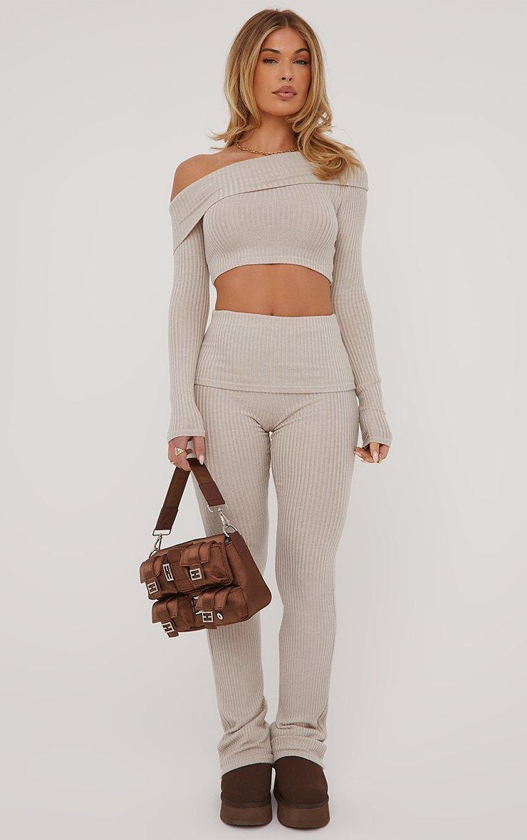 Long Sleeve Asymmetric Fold Over Detail Crop Top In Beige Soft Ribbed