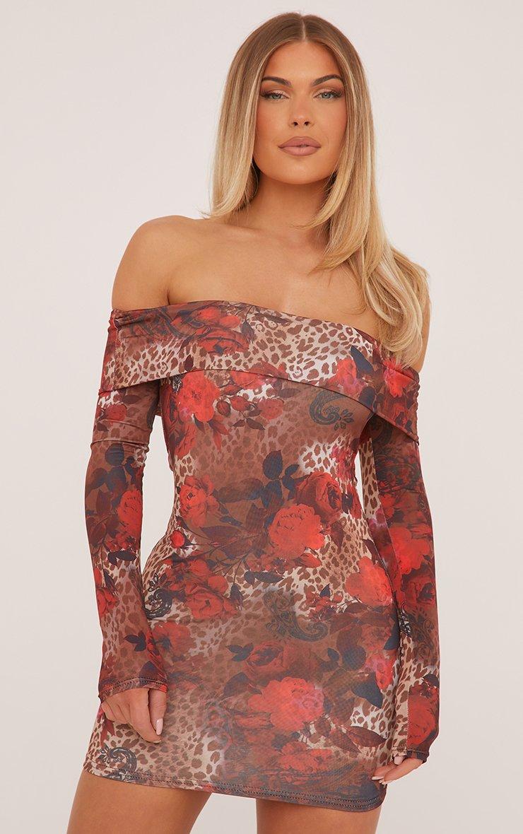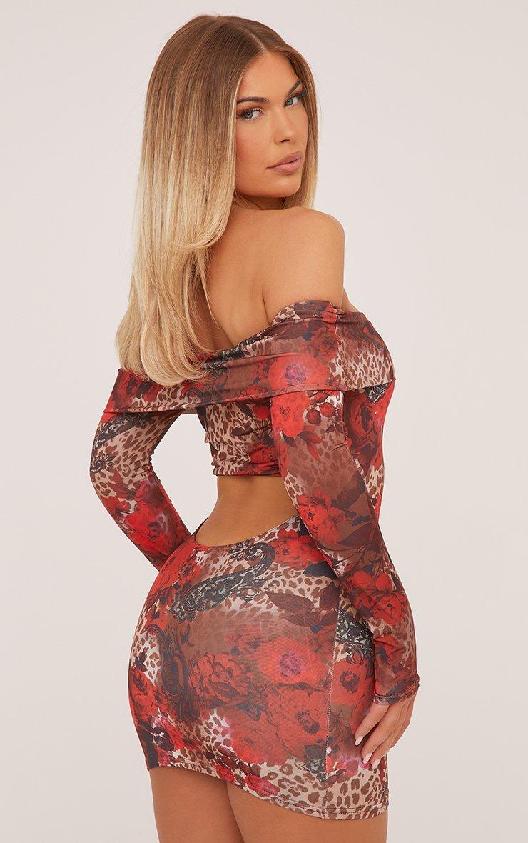 Get that mob wife aesthetic with this dress doll. Featuring a rose leopard print material, a bardot neckline, an open back and a mini length.