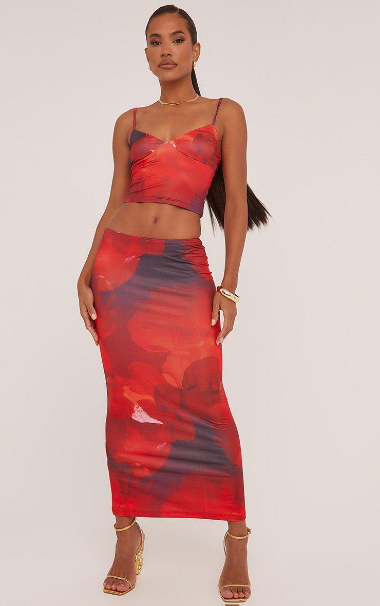 Strappy Crop Top And High Waist Maxi Skirt Co-Ord Set In Red Abstract Print Slinky