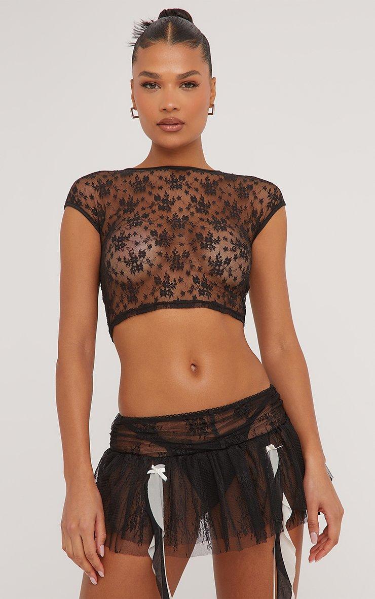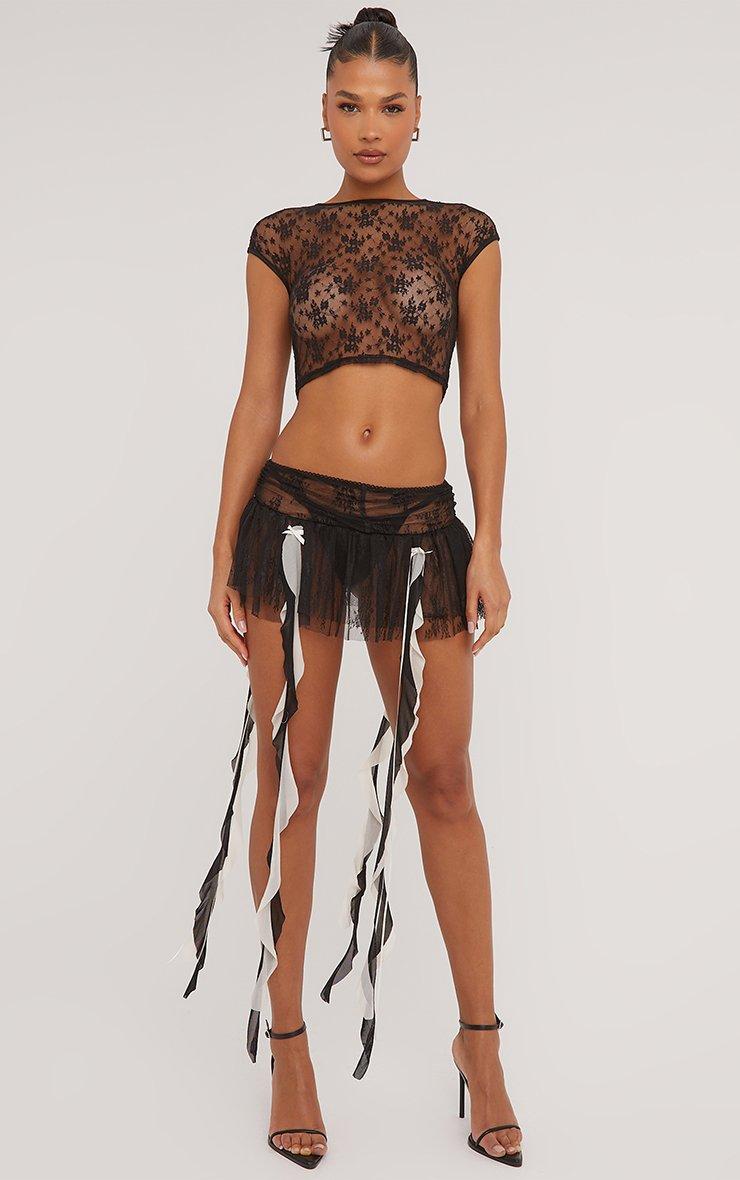 This skirt will earn you all the style points doll. Featuring a black mesh material, a low rise, bow frill detailing and a micro mini length.