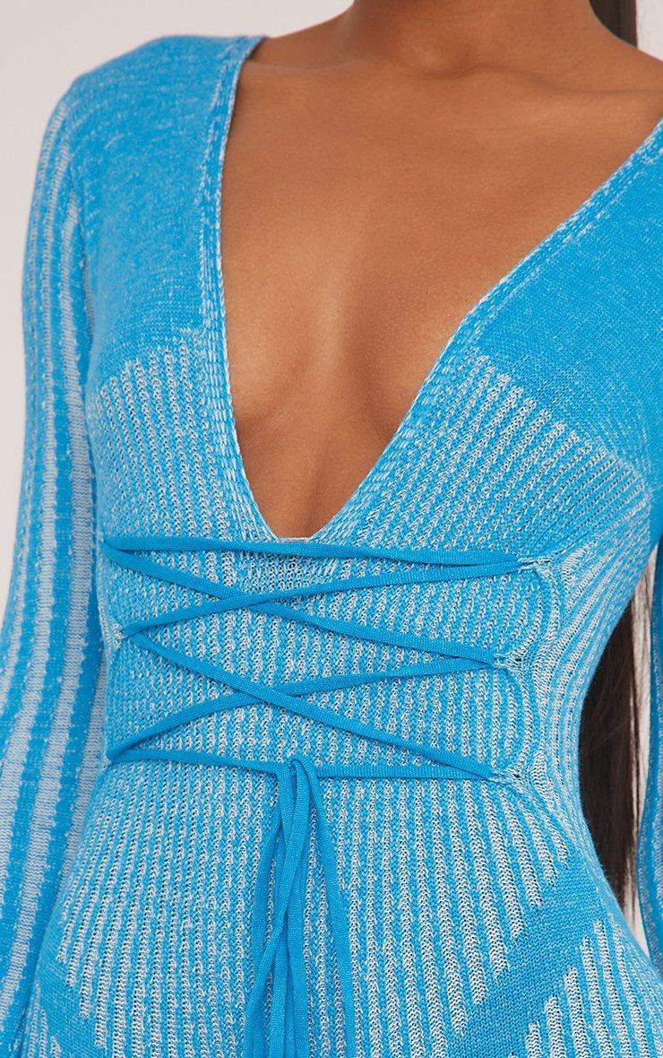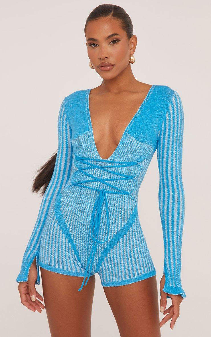 Long Sleeve Plunge Strappy Waist Playsuit In Contrast Bright Blue Knit