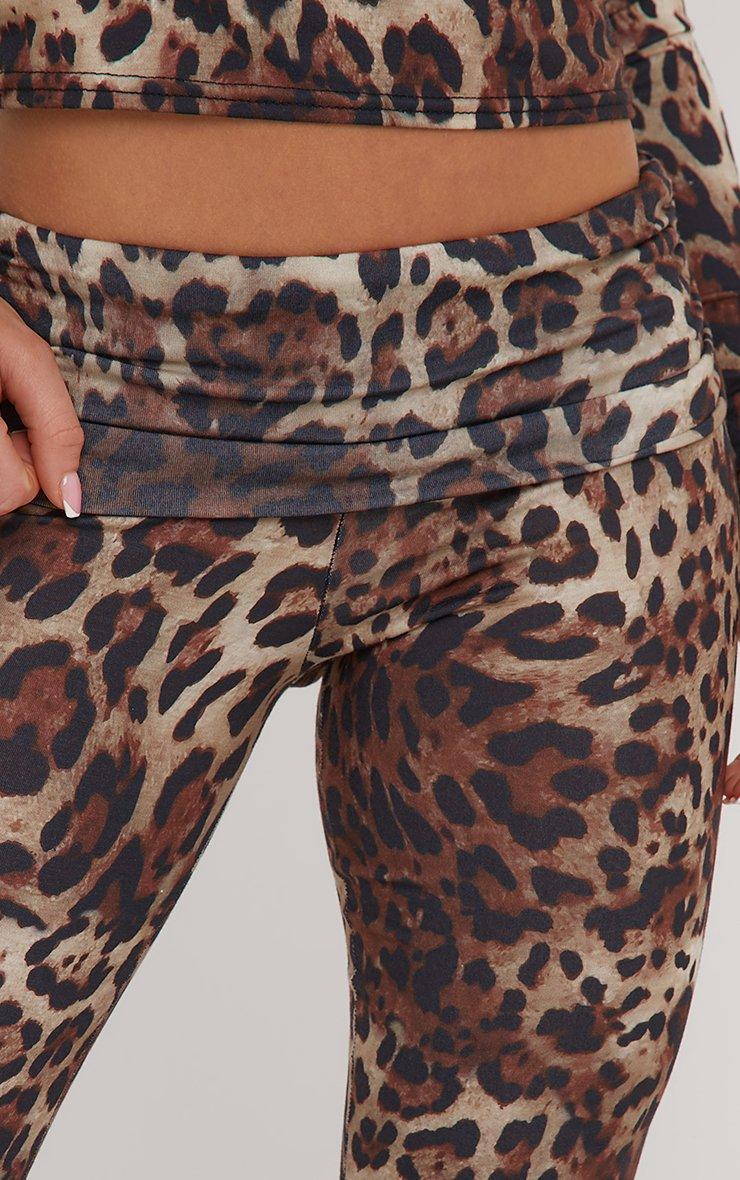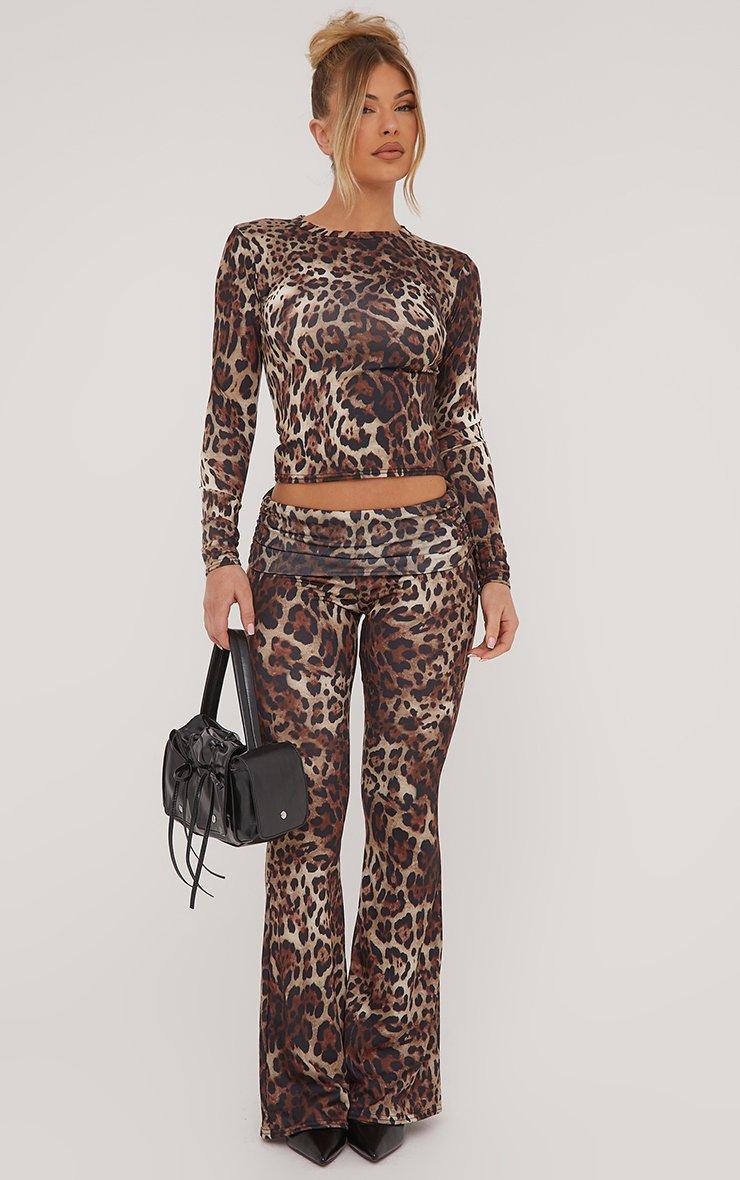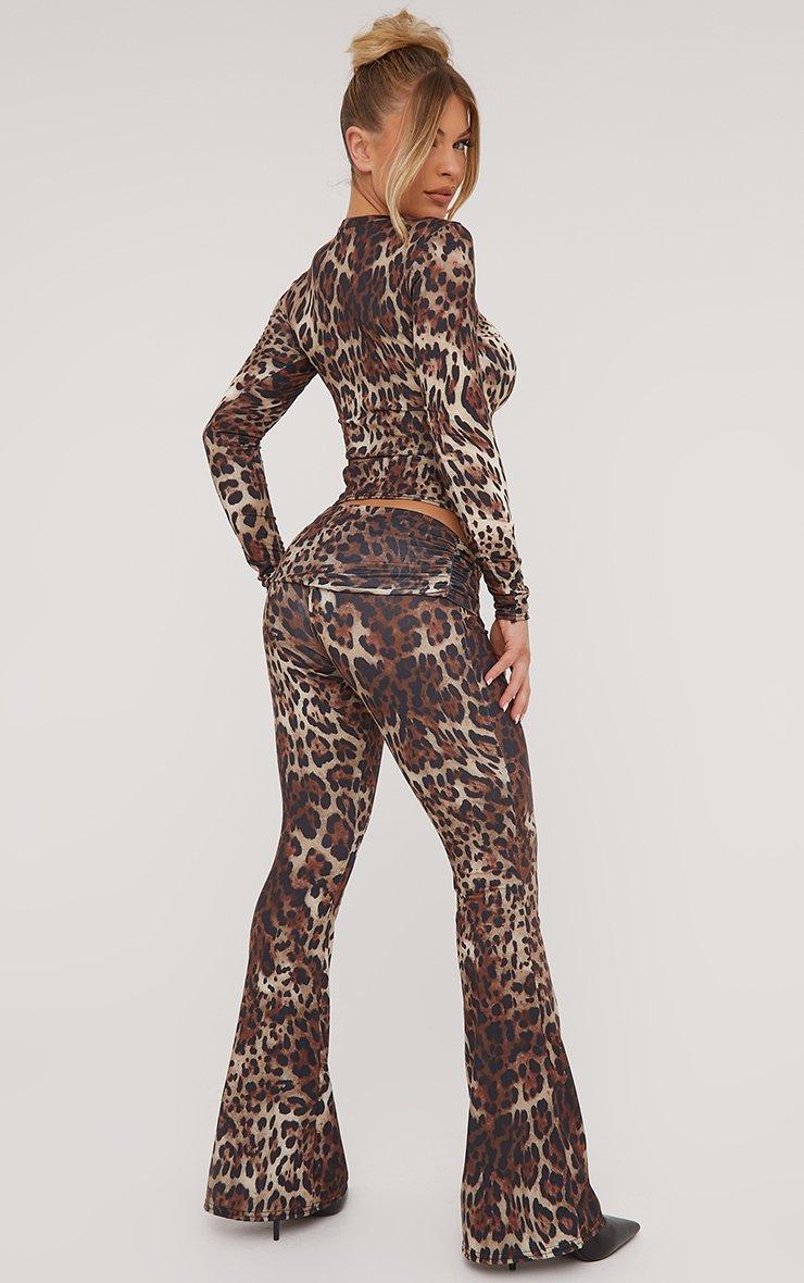 Low Rise Fold Over Waistband Flared Trousers In Brown Leopard Print