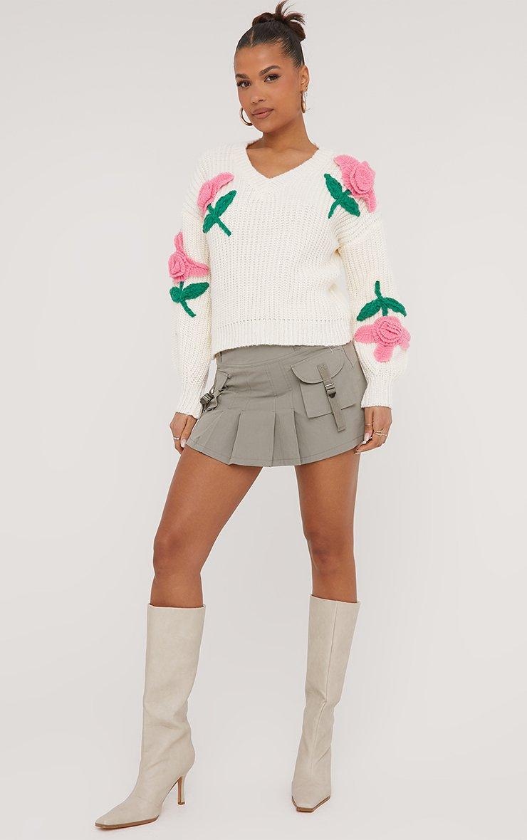 V Neck Oversized Rose Detail Jumper In Cream Knit