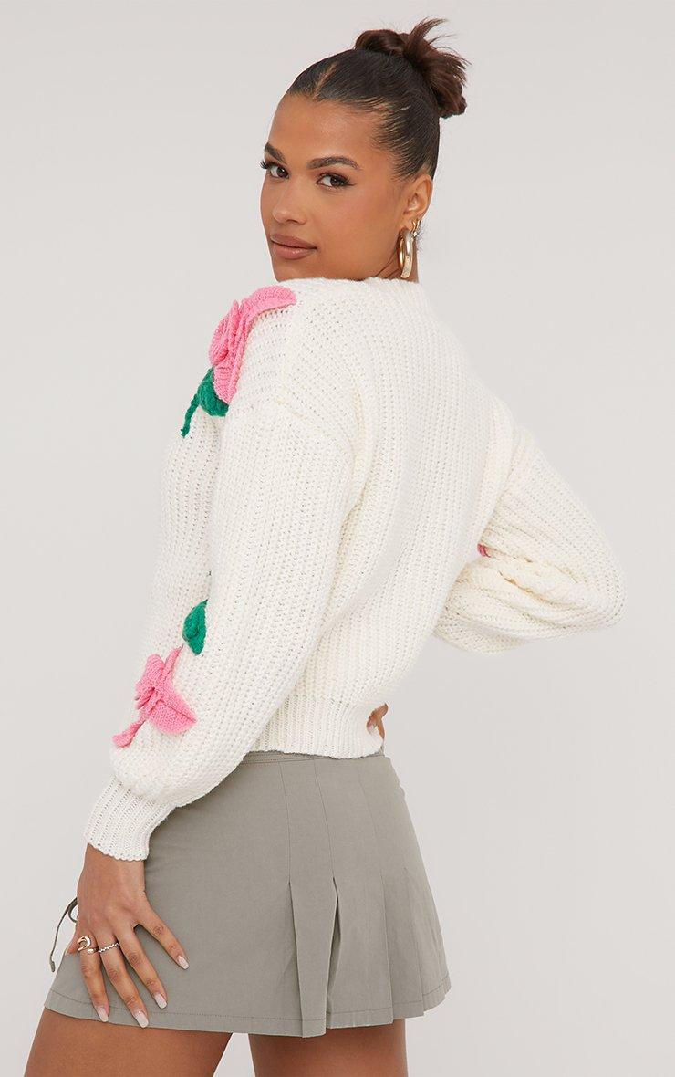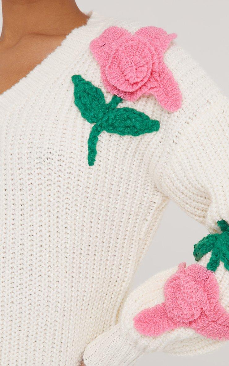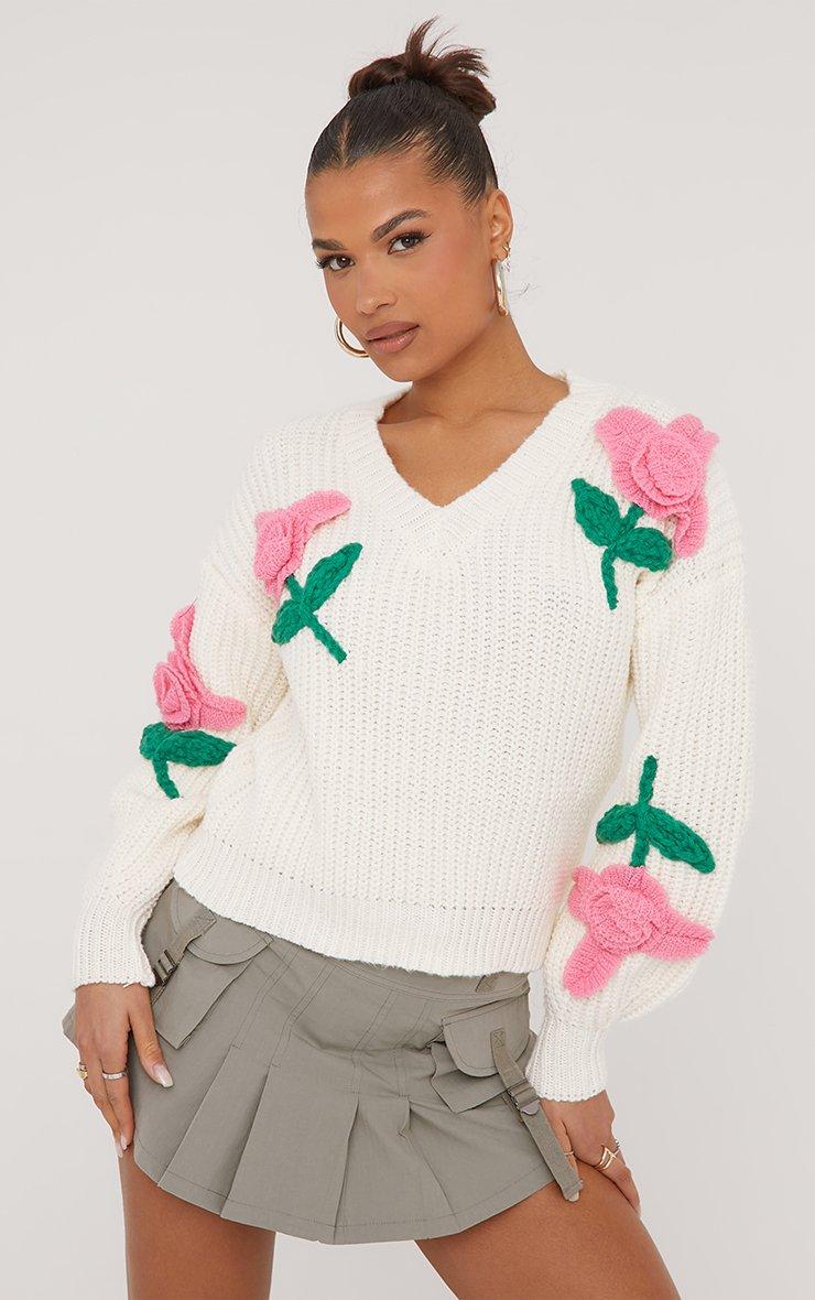 Earn all the style points with this jumper doll. Featuring a cream knit material, a V neckline, rose detailing and an oversized fit.