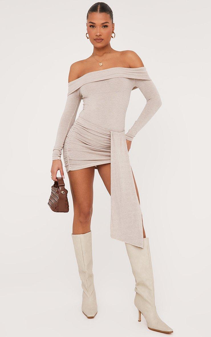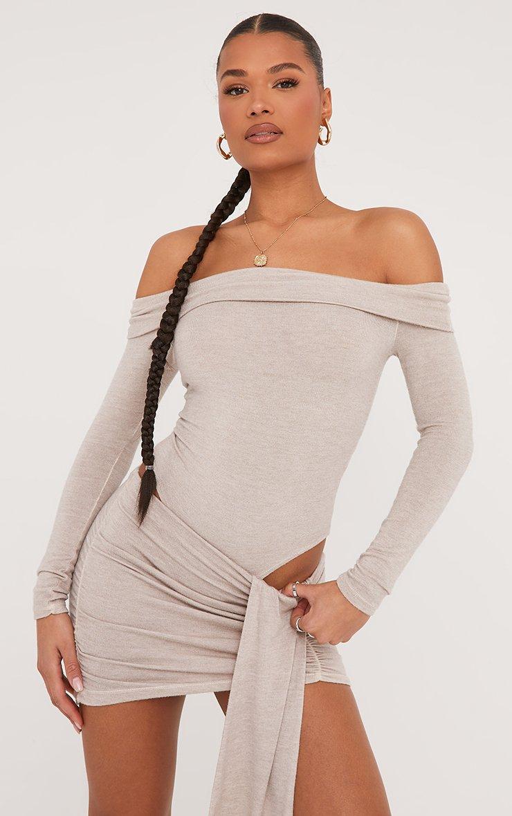 Fold Over Bardot Bodysuit In Stone Soft Knit